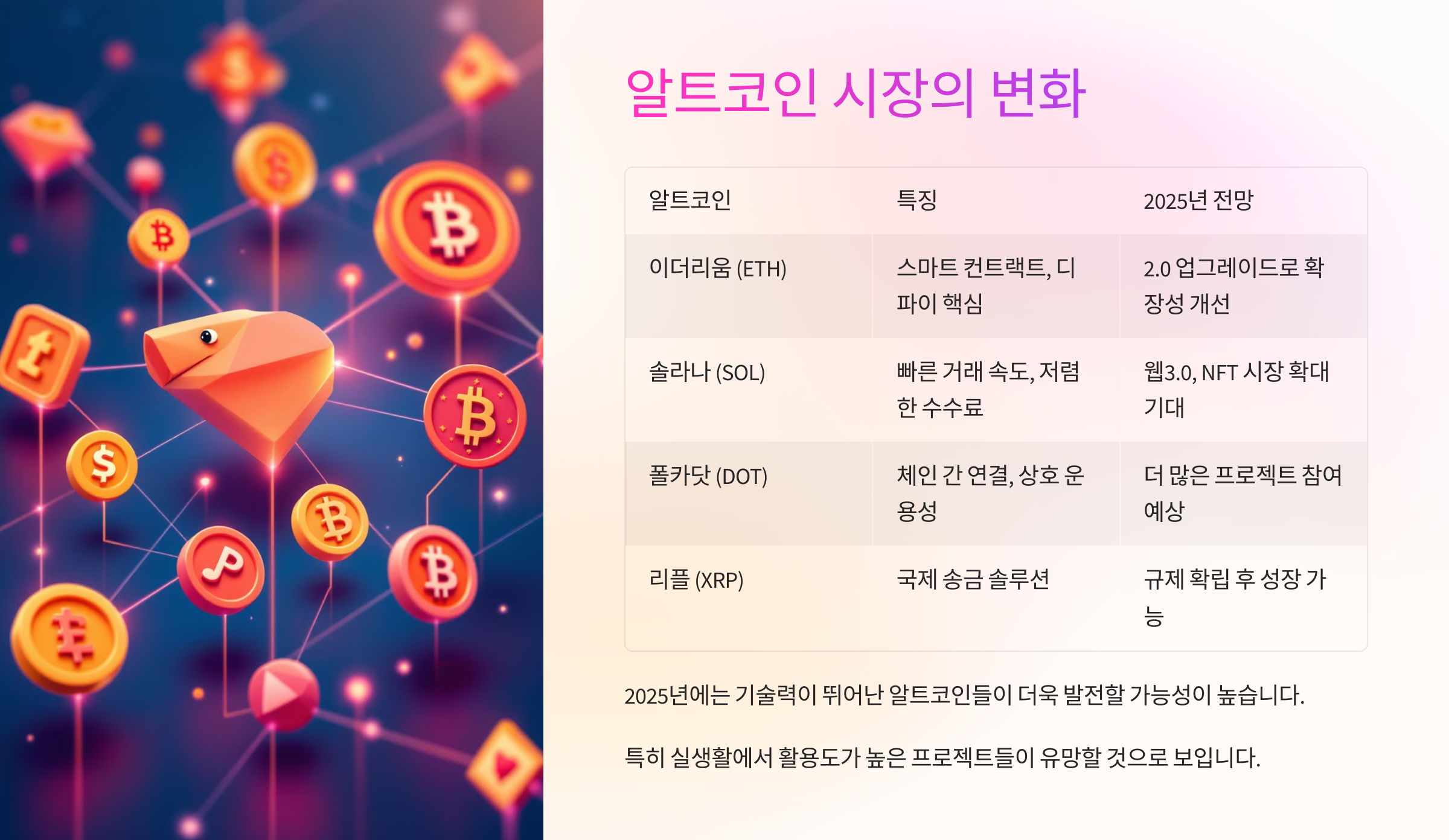 비트코인 외에도 2025년에는 알트코인 시장이 큰 변화를 맞이할 것으로 보여요. 특히 이더리움, 솔라나, 폴카닷 같은 대형 코인들이 중요한 역할을 할 것으로 예상돼요. 🚀