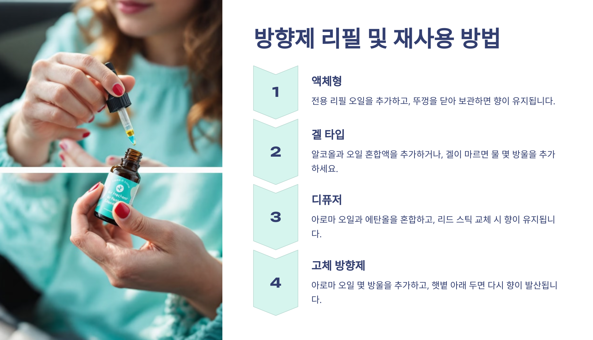 특히 액체형이나 디퓨저 타입 방향제는 리필 오일을 채워 넣으면 새것처럼 사용할 수 있어요. 겔 타입은 굳어질 경우 간단한 방법으로 재생할 수 있답니다. ✅