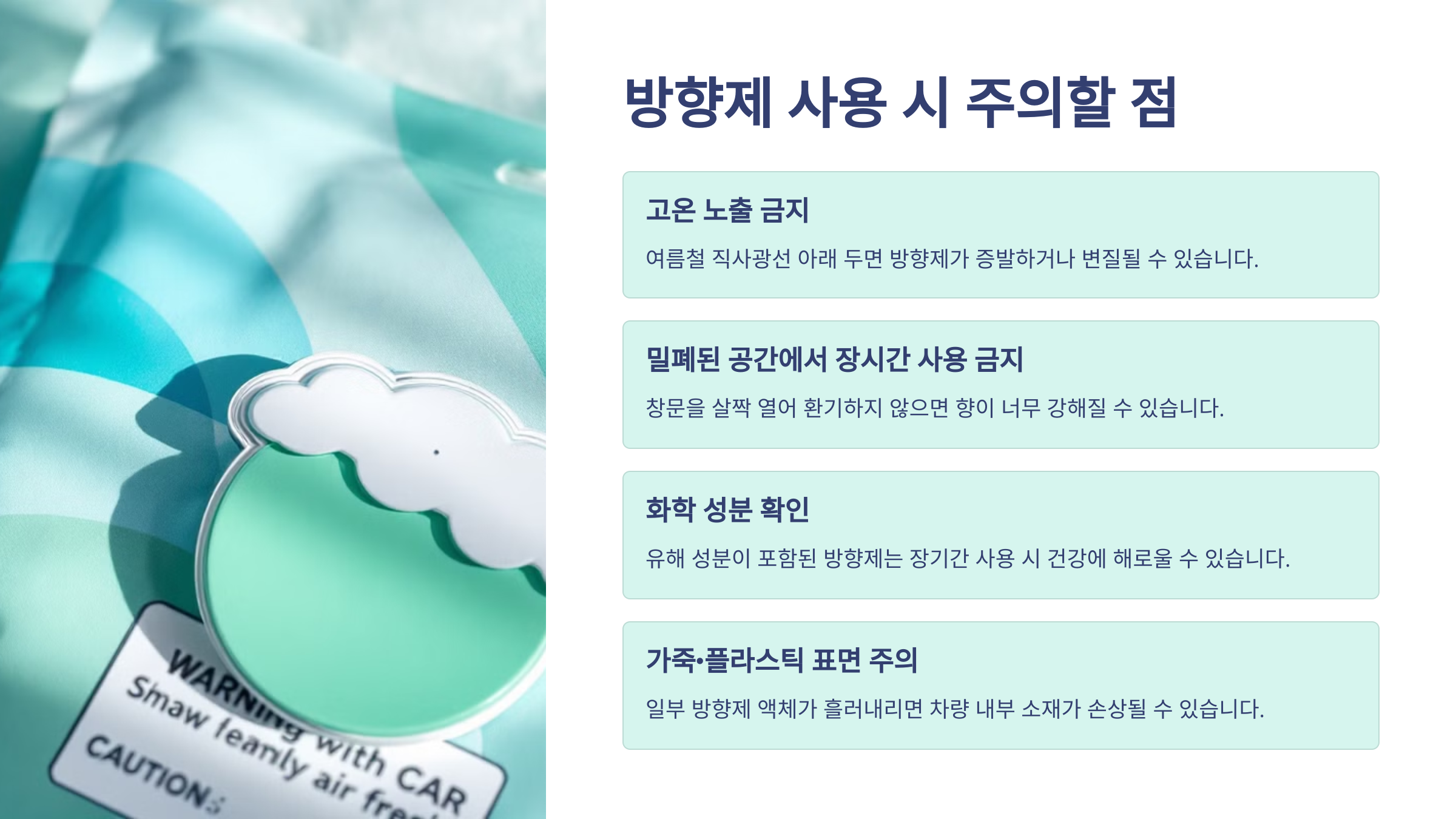잘못된 사용법은 방향제의 효과를 떨어뜨릴 뿐만 아니라 차량 내부 환경에도 좋지 않을 수 있어요. 아래 사항을 꼭 체크하세요! ✅