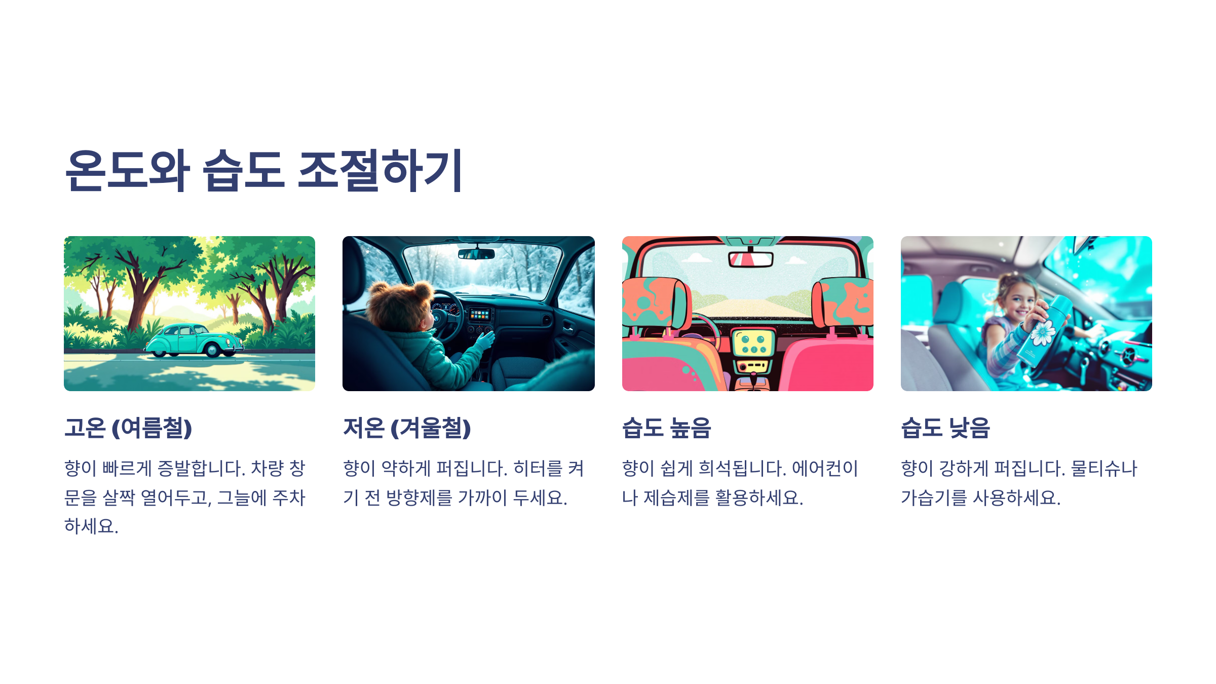 | 고온 (여름철) | 향이 빠르게 증발 | 차량 창문 살짝 열어두기, 그늘에 주차 |