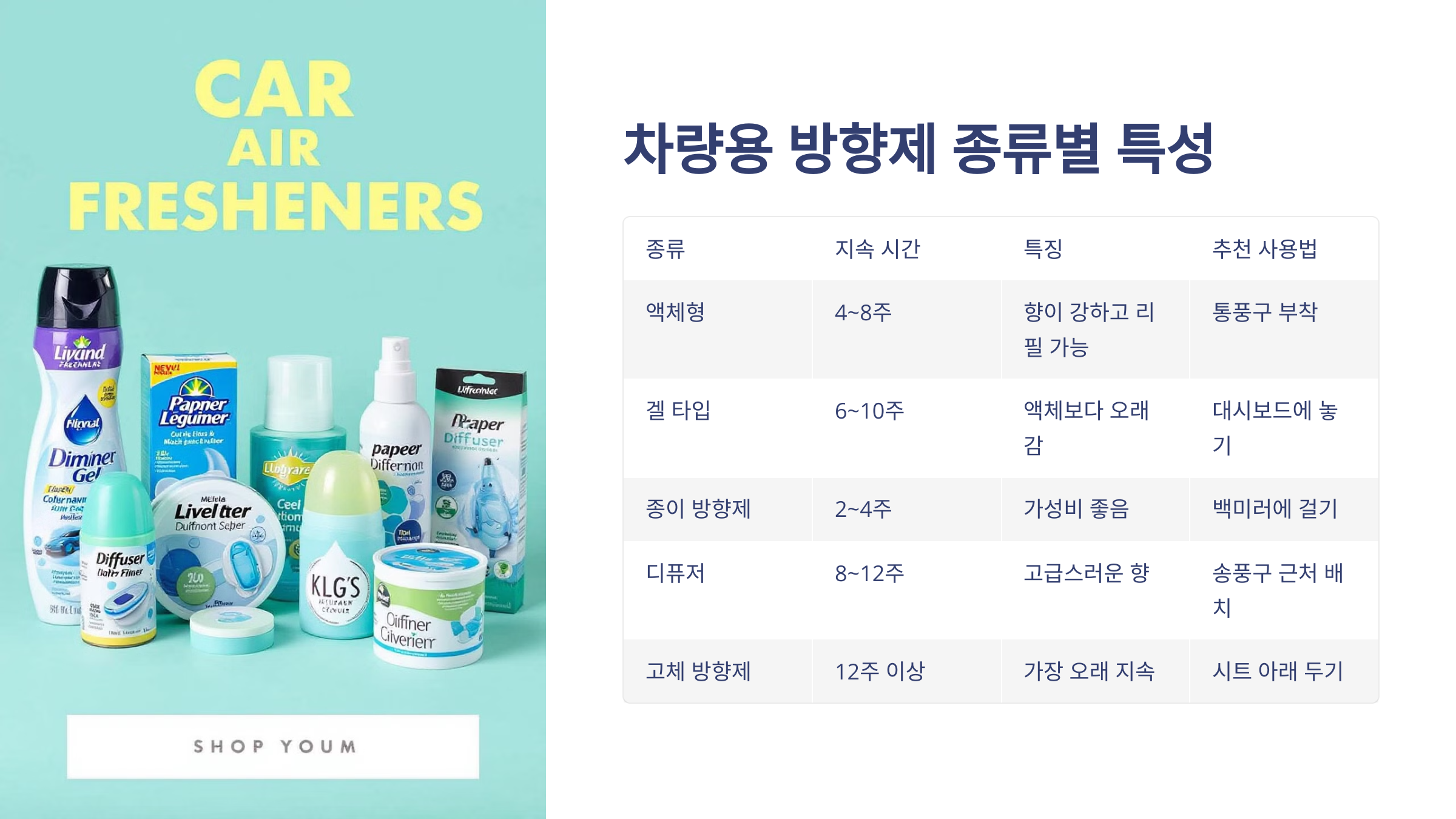 차량용 방향제는 종류별로 향 지속 시간이 다르고, 관리법도 달라요! 🚘