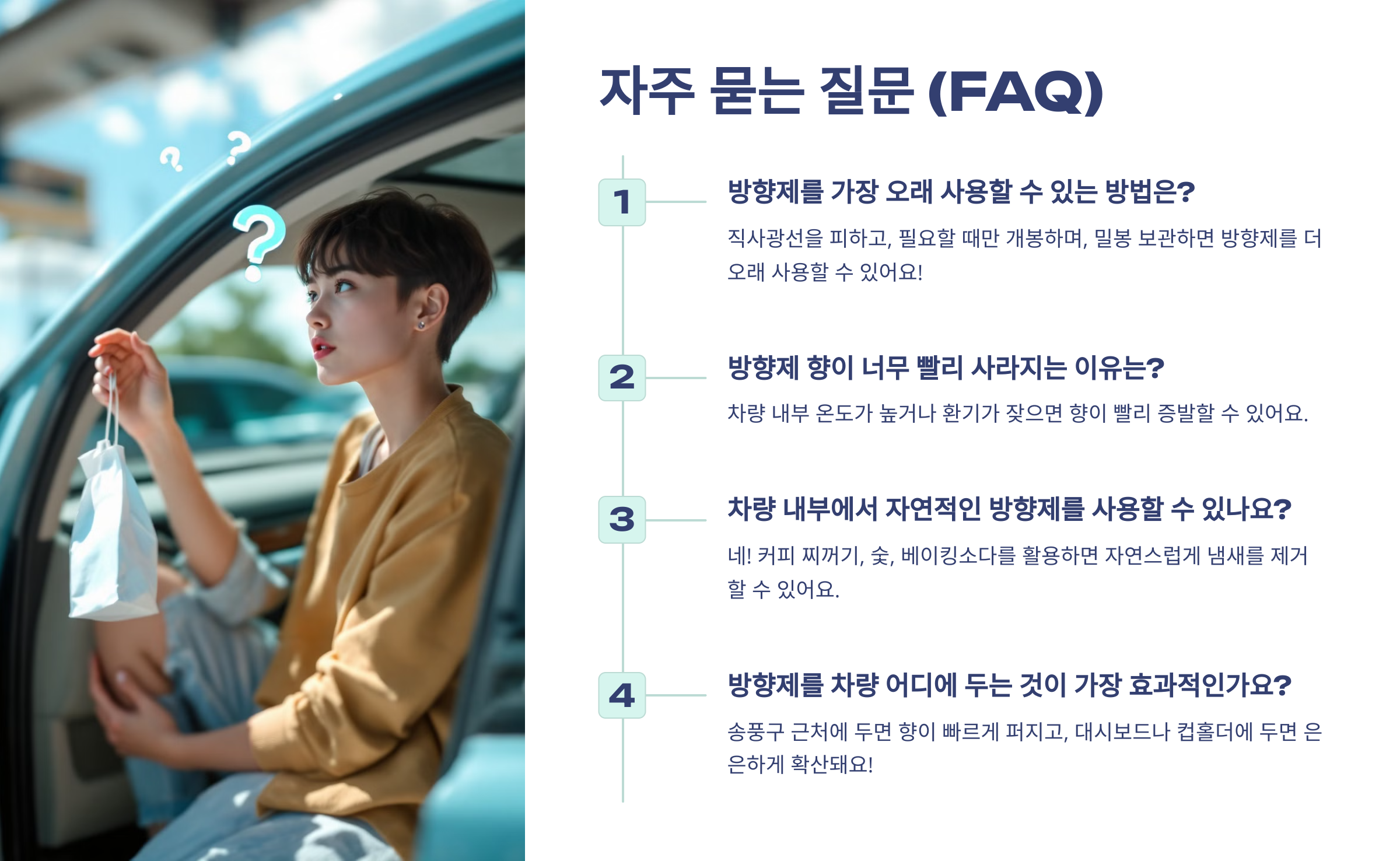 여름철에는 차량 내부 온도를 낮추고, 겨울철에는 적절한 습도를 유지하면 방향제를 더 오래 사용할 수 있어요! ⏳