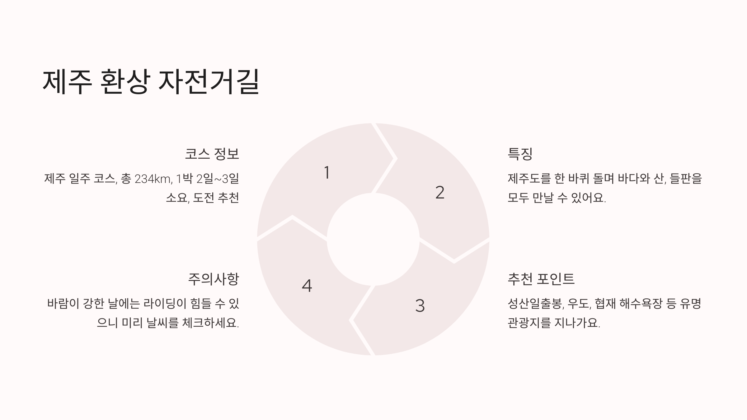 이 코스는 제주의 해안도로를 따라 이어지며, 성산일출봉, 우도, 협재 해수욕장 등 유명한 관광지를 지나가요. 특히 바람이 시원한 가을과 봄 시즌에 달리면 최고의 풍경을 감상할 수 있어요.