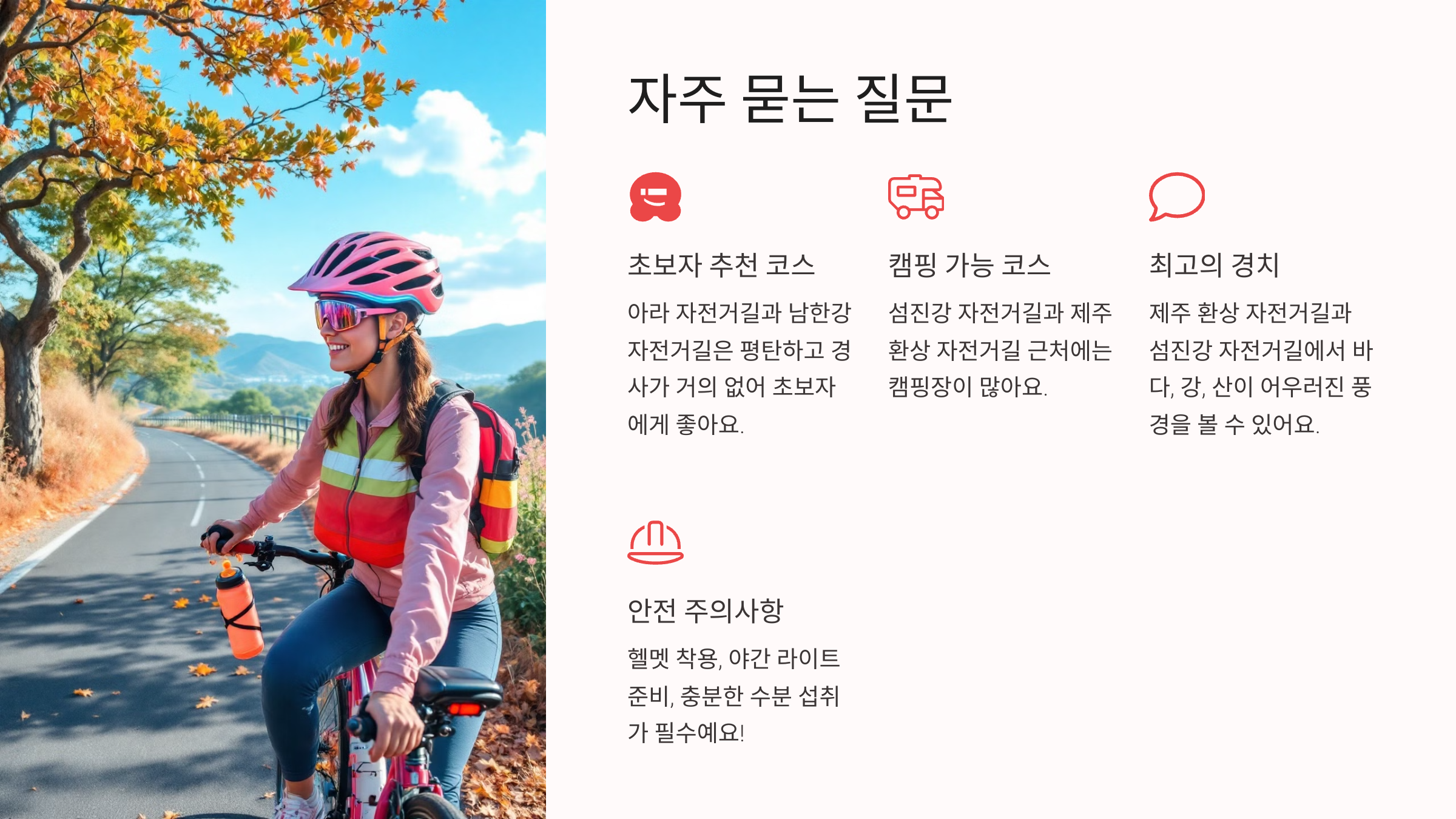 A8. 헬멧 착용, 야간 라이트 준비, 충분한 수분 섭취가 필수예요! 또한, 보행자와 함께 사용하는 구간에서는 속도를 줄이고 안전하게 주행하세요. 🚴‍♀️🚦