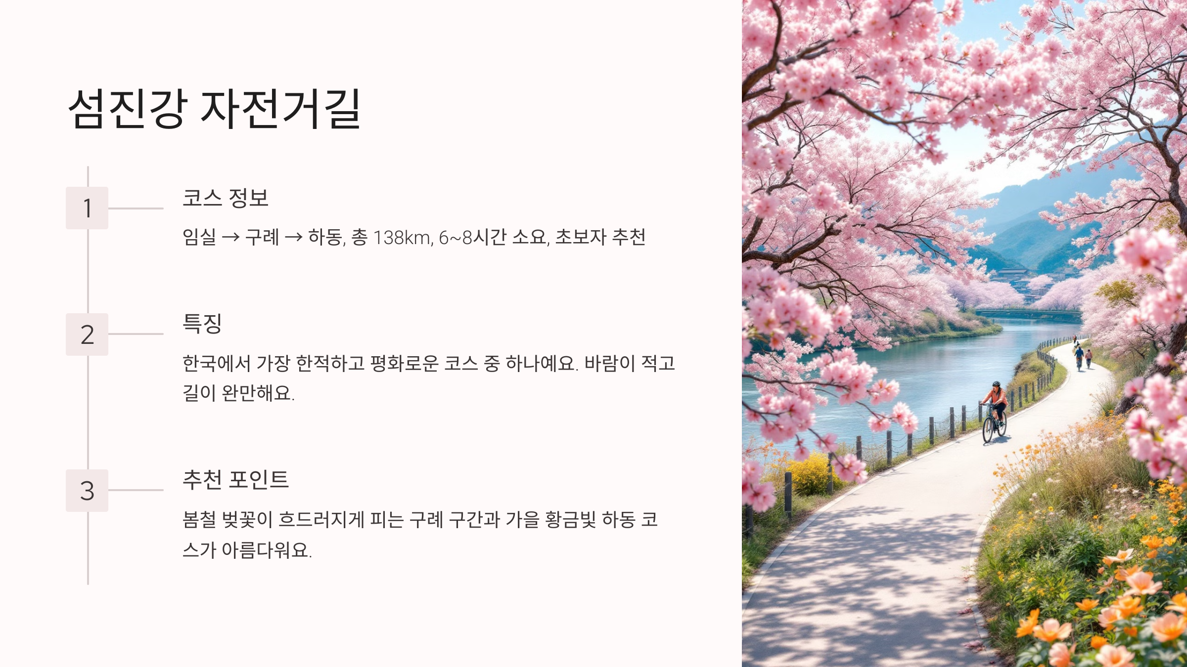 섬진강 자전거길은 전라남도와 전라북도를 잇는 아름다운 강변길로, 한국에서 가장 한적하고 평화로운 코스 중 하나예요. 🚴‍♀️