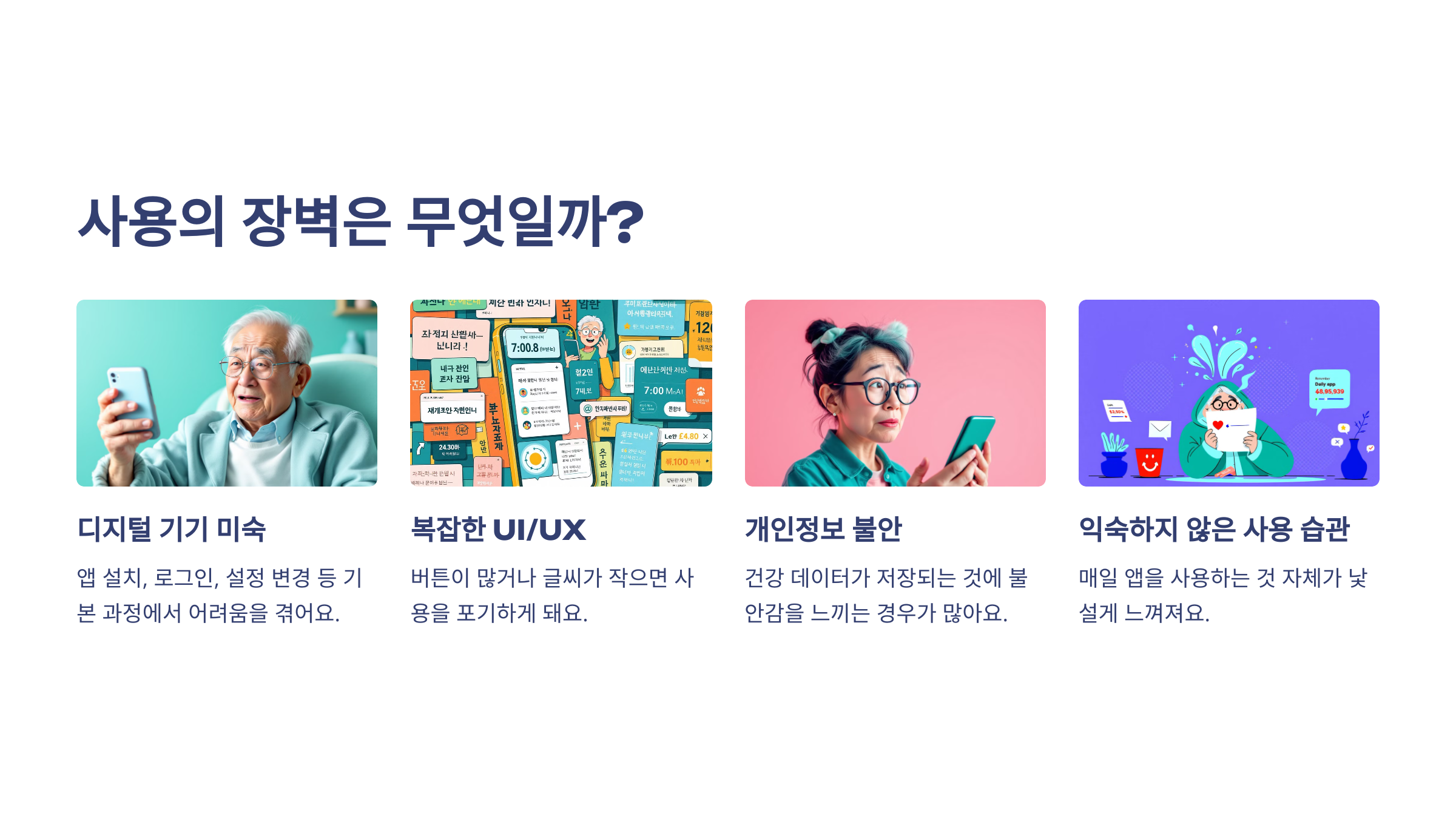 아무리 좋은 의료 AI 기술이 있어도, 실제 사용까지 연결되지 않으면 무용지물이에요. 특히 부모님 세대에게는 몇 가지 분명한 장벽이 존재해요. 그 장벽이 무엇인지 알고 대비해야, 진짜 도움이 되는 서비스를 만들 수 있어요.