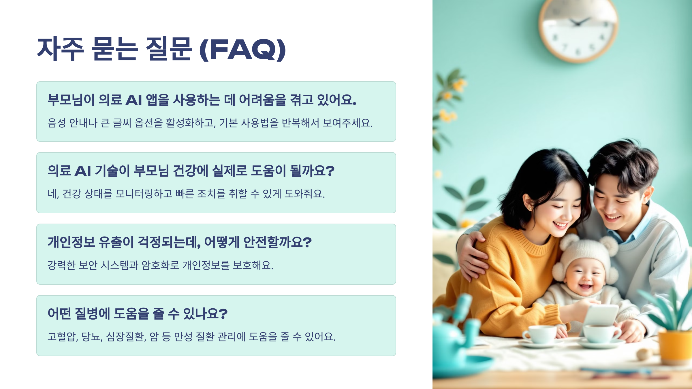 마지막으로, 부모님 세대가 실제로 이런 AI 서비스를 잘 활용할 수 있도록 도와주는 팁과 함께, 자주 묻는 질문들을 정리한 FAQ로 마무리할게요. 📋