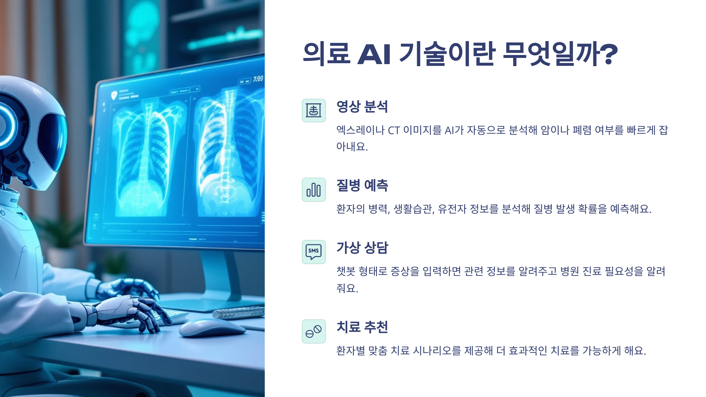 의료 AI 기술은 쉽게 말해 병원에서 의사가 하는 일을 일부 또는 전체적으로 도와주는 인공지능이에요. 영상 판독, 질병 예측, 진단 보조, 환자 맞춤 치료 추천까지 다양한 영역에서 쓰이고 있어요. 그리고 그 정확도와 속도는 해마다 놀랍게 향상되고 있죠.