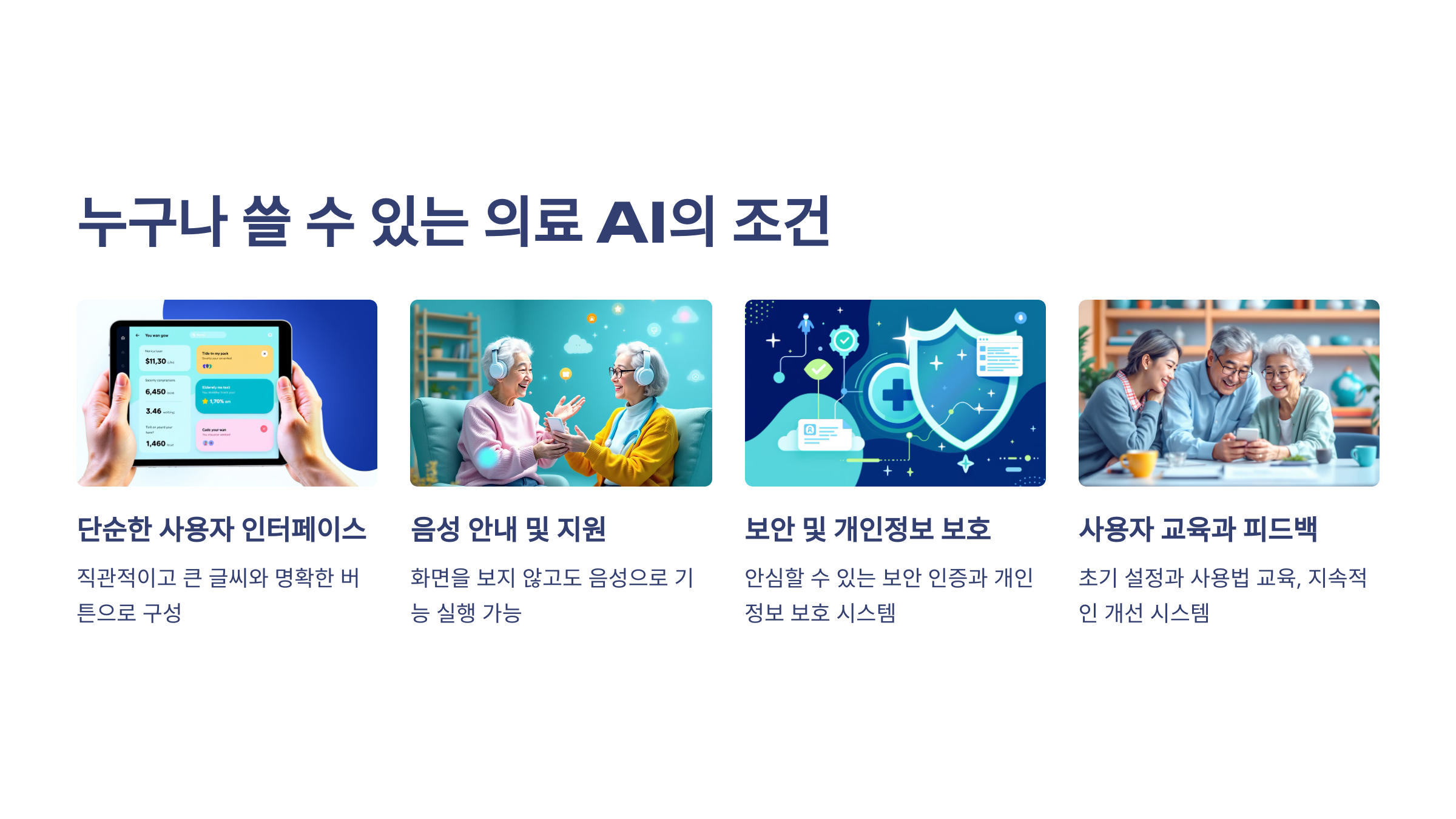 그럼 어떻게 하면 모든 세대가 AI 의료기술을 편하게 쓸 수 있을까요? 마지막으로, 누구나 쉽게 접근할 수 있는 의료 AI의 조건을 정리해볼게요. 🤝