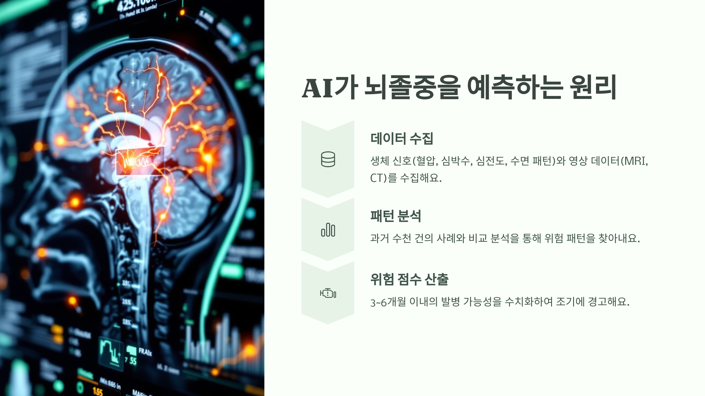 AI는 평소 수집된 생체 신호(혈압, 심박수, 심전도, 수면 패턴 등)와 영상 데이터(MRI, CT)를 분석해 '뇌졸중 위험 점수'를 예측해줘요. 이를 통해 3개월~6개월 이내의 발병 가능성을 조기에 경고할 수 있어요.