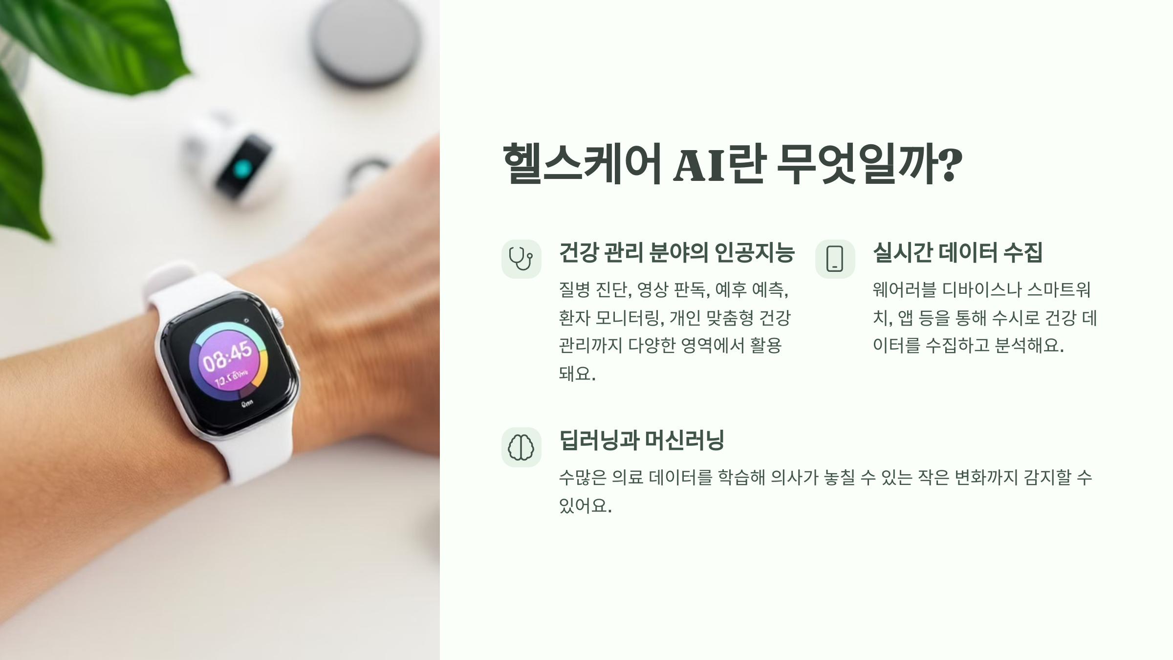 헬스케어 AI는 말 그대로 '건강 관리 분야에서 인공지능을 활용하는 기술'이에요. 질병 진단, 영상 판독, 예후 예측, 환자 모니터링, 개인 맞춤형 건강관리까지 다양한 영역에서 빠르게 확산되고 있죠.