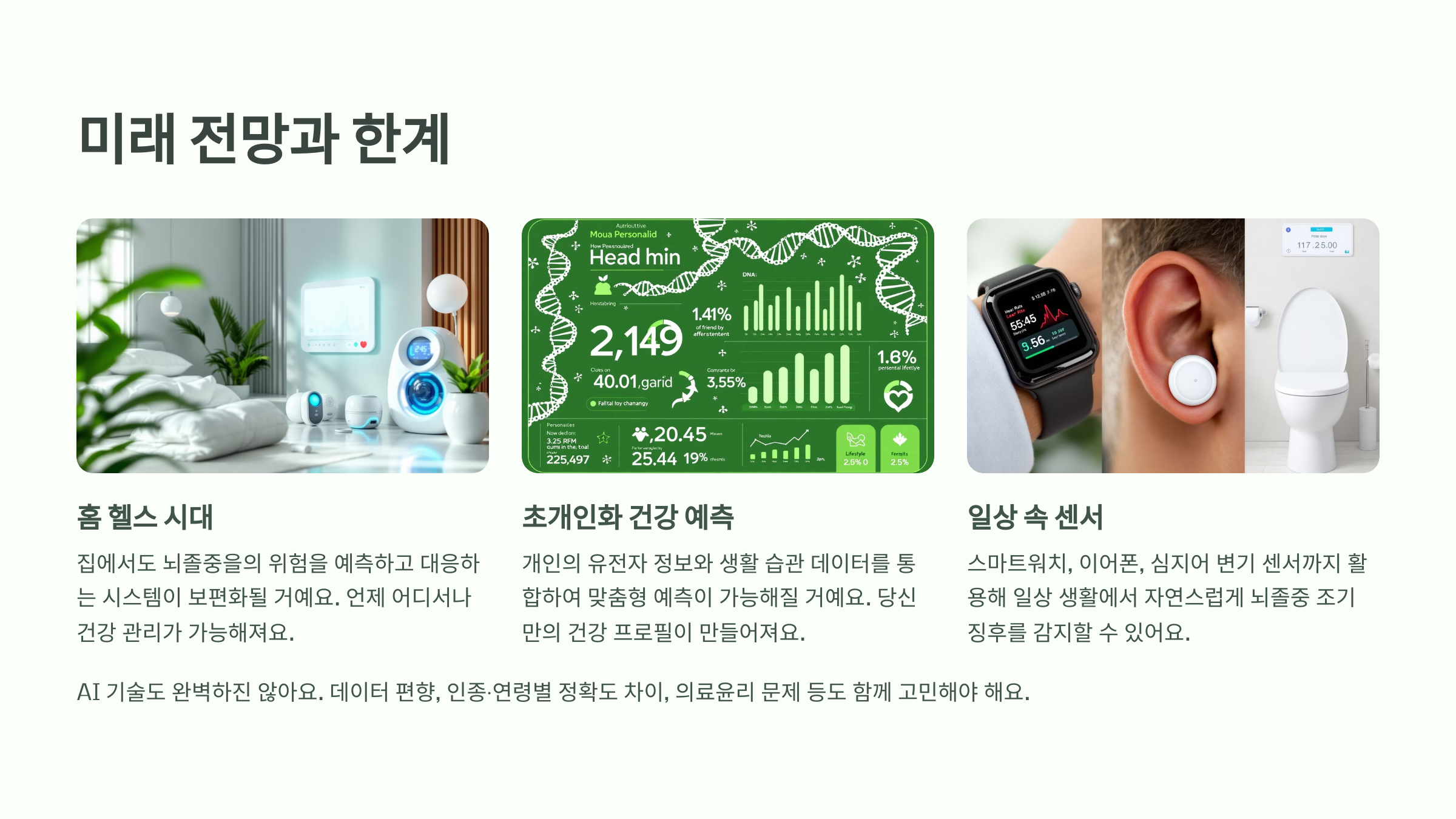 AI가 뇌졸중을 예측하는 시대가 이미 도래했지만, 아직 해결해야 할 부분도 있어요. 지금은 의사의 보조 역할에 머물러 있지만, 앞으로는 개인 맞춤형 조기 경고 시스템으로 발전할 가능성이 커요.