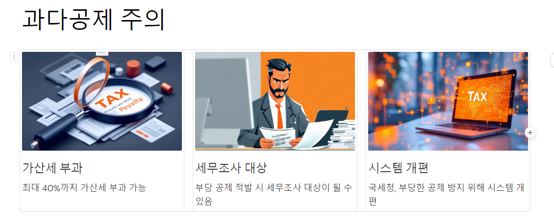 - 부당 공제가 적발되면 최대 40%까지 가산세가 부과될 수 있으며, 추후 세무조사의 대상이 될 수 있습니다.