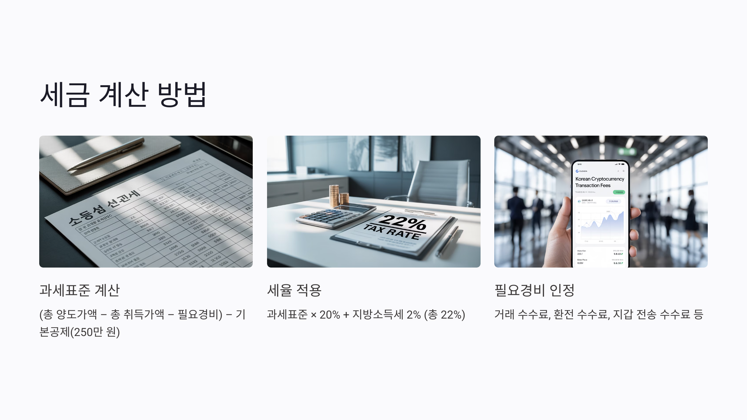 가상자산 세금은 단순히 ‘수익 × 세율’로 계산되는 게 아니에요. 기본공제, 필요경비, 양도 시점의 가격, 매입가, 수수료 등 다양한 요소들이 함께 고려돼요. 잘못 계산하면 세금을 과하게 내거나 누락될 수 있어요. 😵💫