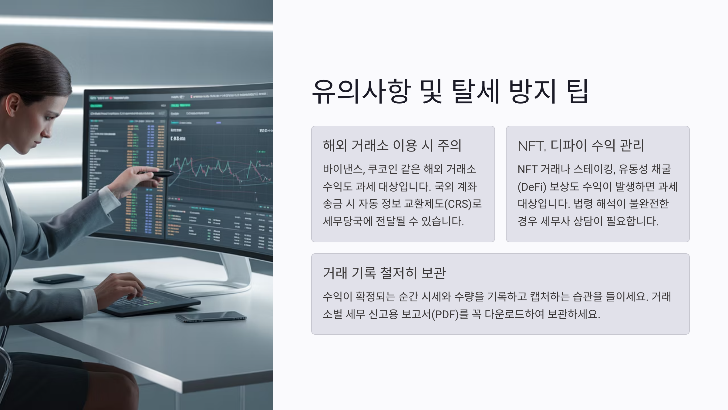 바이낸스, 쿠코인 같은 해외 거래소에서 발생한 수익도 과세 대상이에요. 특히 국외 계좌에서 자금을 인출하거나 국내 계좌로 송금할 경우 자동 정보 교환제도(CRS)에 의해 세무당국에 전달될 수 있어요.