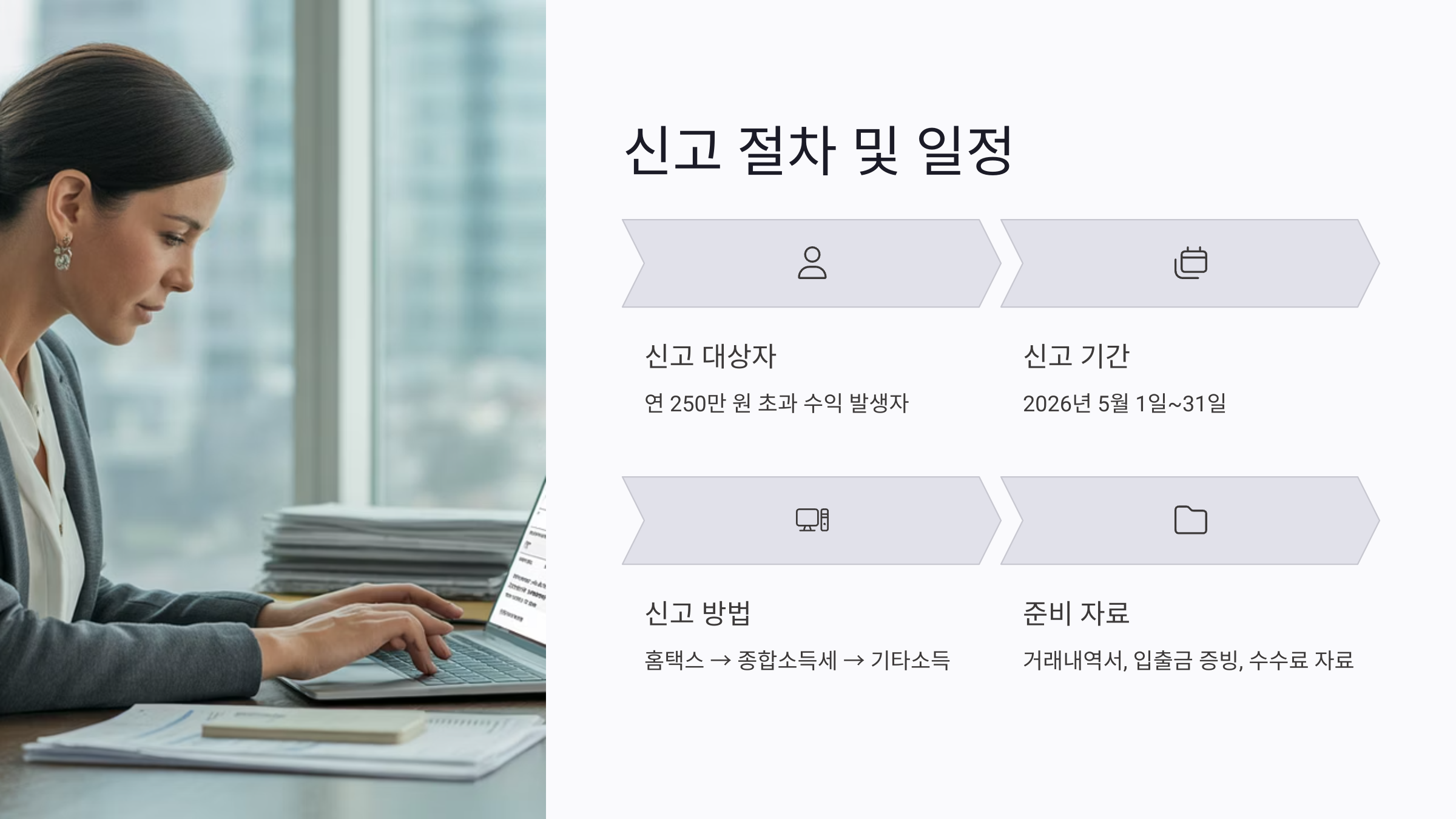 과세 기준일은 2025년 1월 1일부터고, 해당 연도에 발생한 소득에 대해 2026년 5월 종합소득세 신고 기간에 신고하게 돼요. 중간예납은 없고, 일괄 정산 방식이에요.