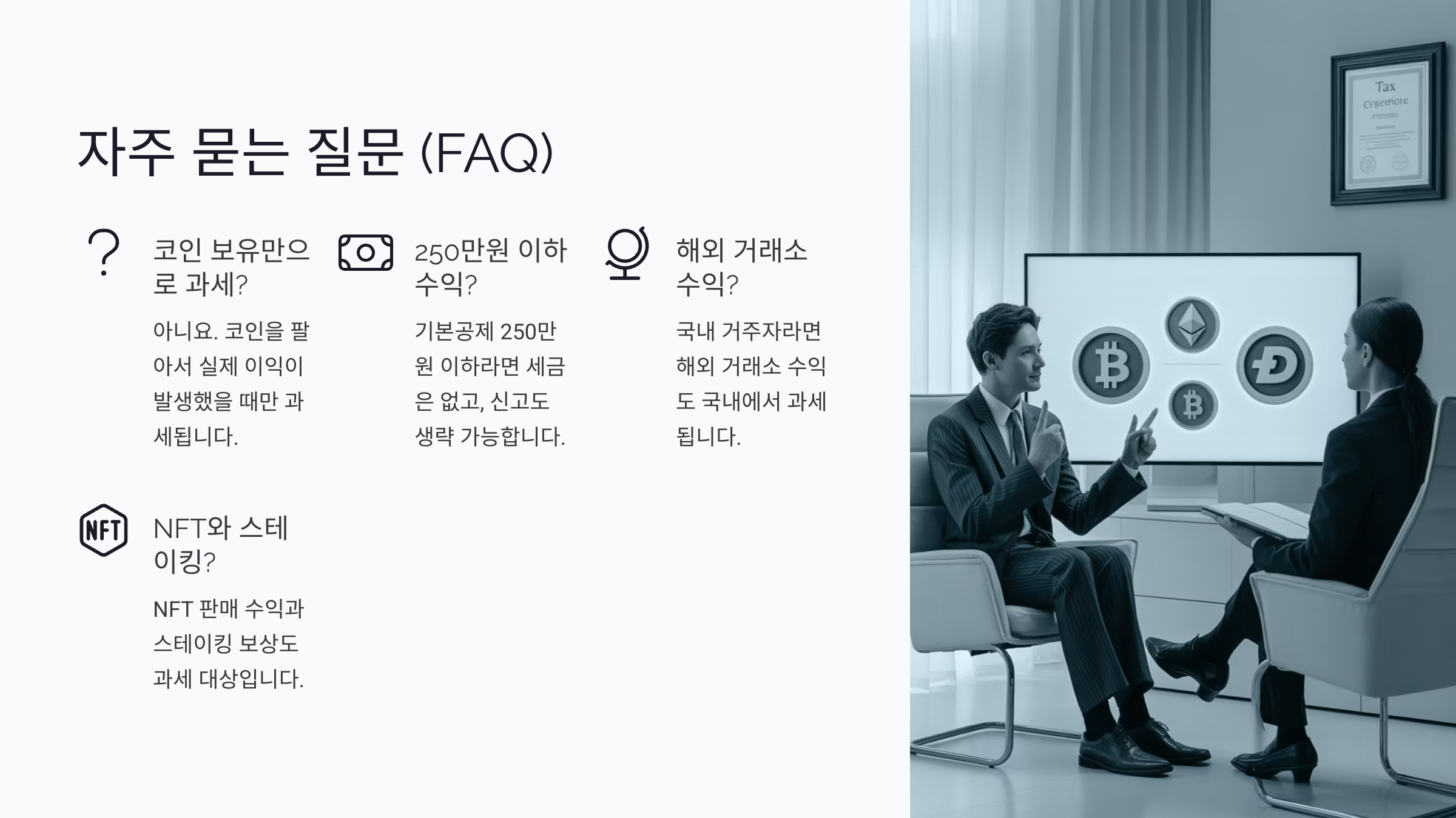 A8. 연간 수익이 단순하고 거래 내역이 명확하다면 혼자서도 가능해요. 하지만 다수 코인, 해외거래소, NFT 수익이 섞여 있다면 세무사 상담을 권장해요.