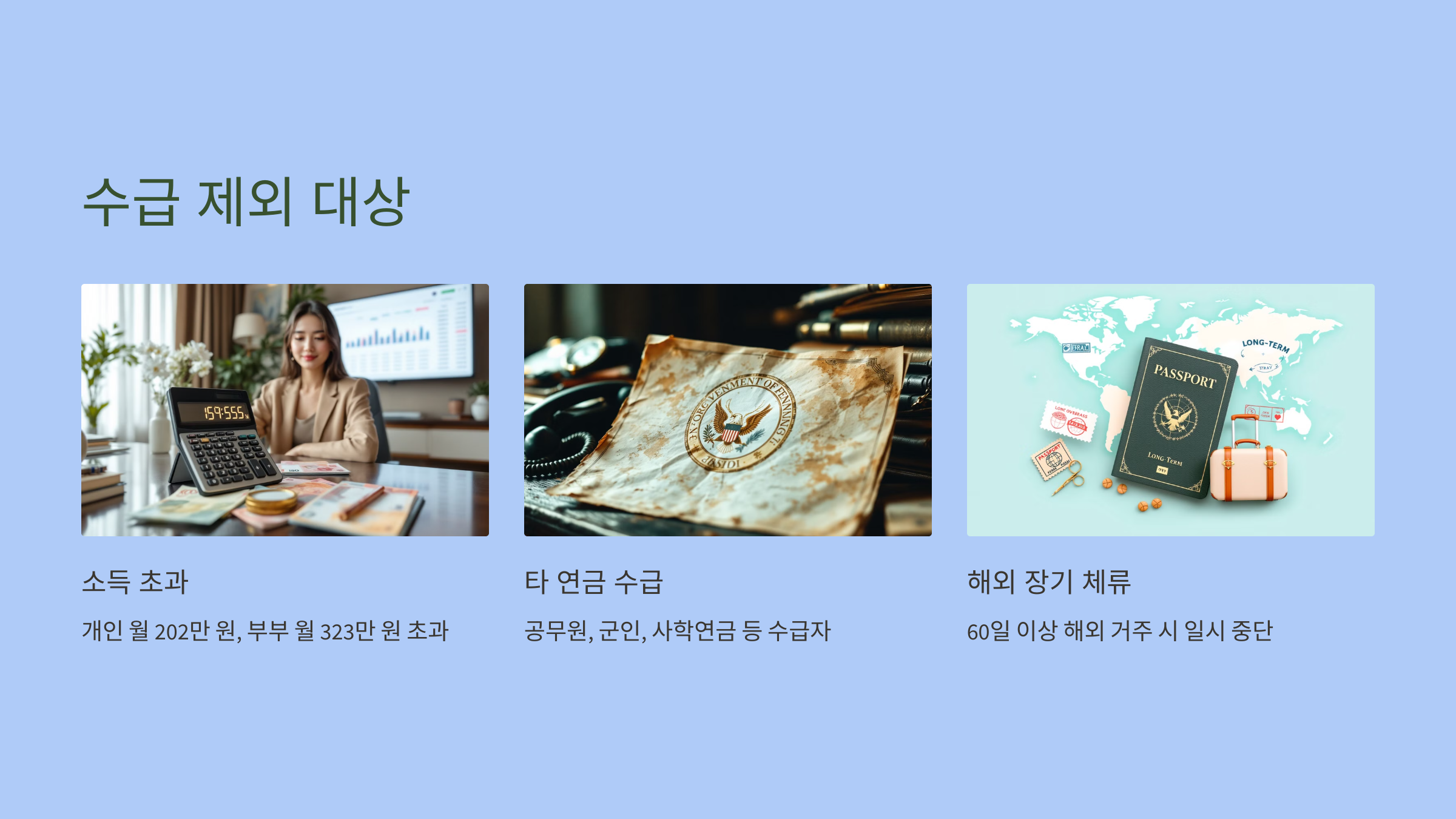 기타로, 해외에 장기간 거주하고 있는 경우도 수급 대상에서 제외될 수 있어요. 특히 60일 이상 해외에 머물게 되면 연금 지급이 일시적으로 중단될 수 있으니 주의가 필요해요.