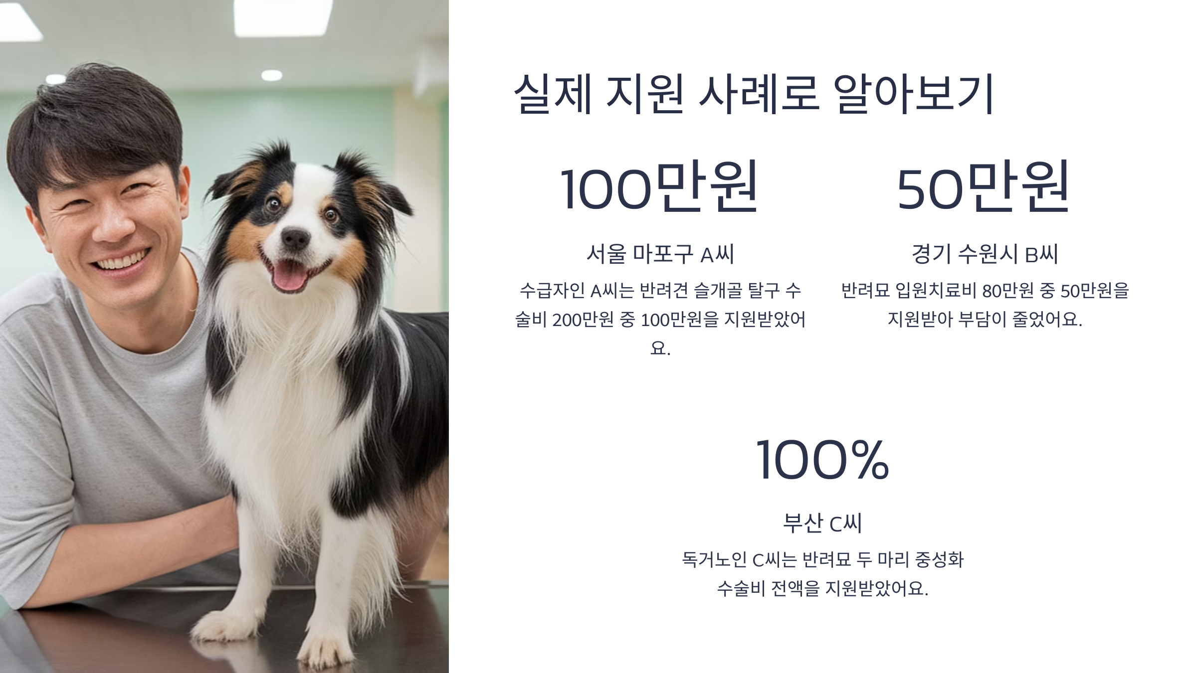 수급자인 A씨는 반려견이 슬개골 탈구로 수술이 필요해 의료비 200만원 발생. 지원금 100만원을 지급받아 부담이 크게 줄었어요.