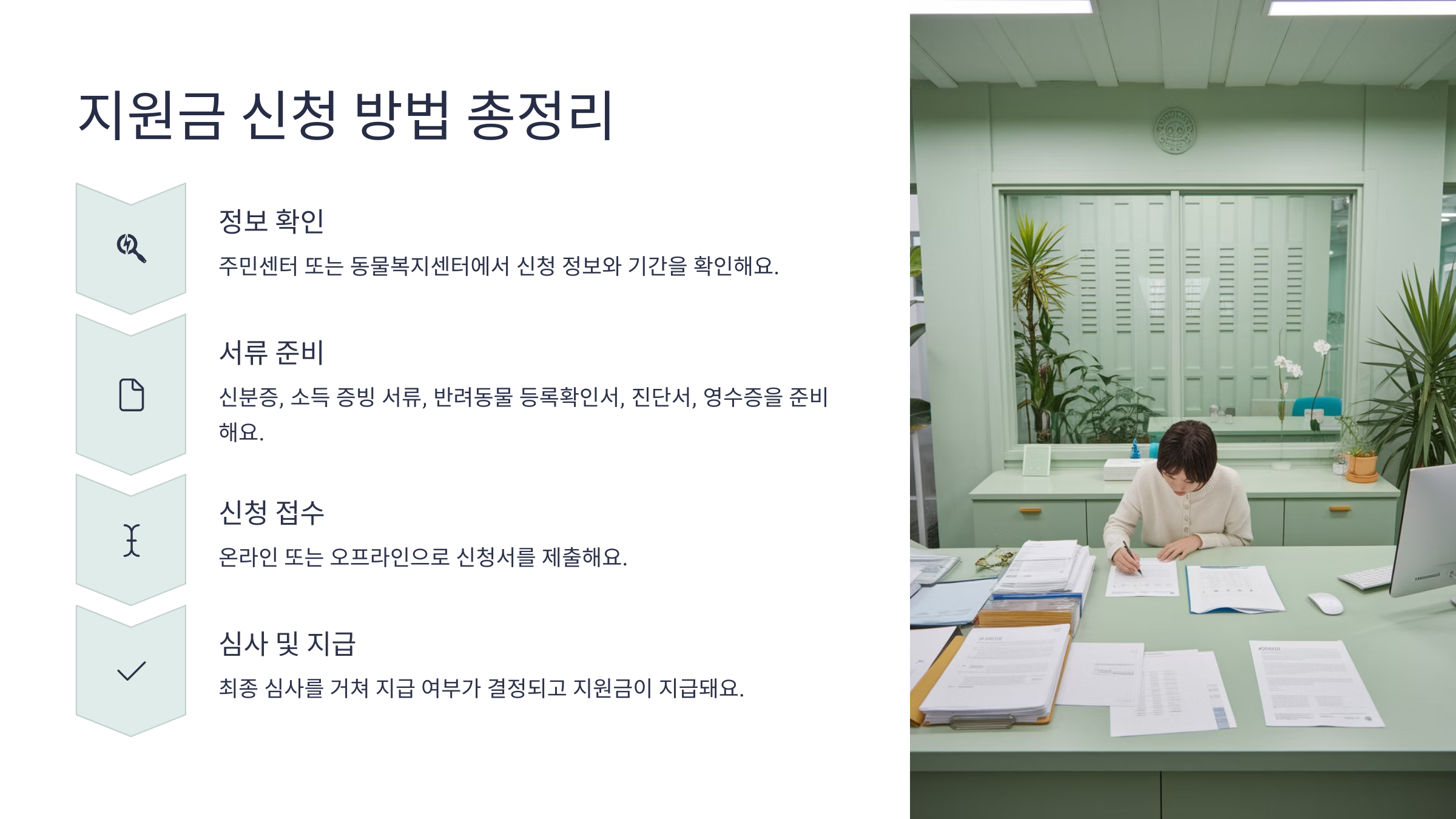 반려동물 의료비 지원을 받기 위해서는 반드시 정해진 신청절차를 거쳐야 해요. 지자체마다 방법은 살짝 다르지만 기본 흐름은 비슷하답니다.