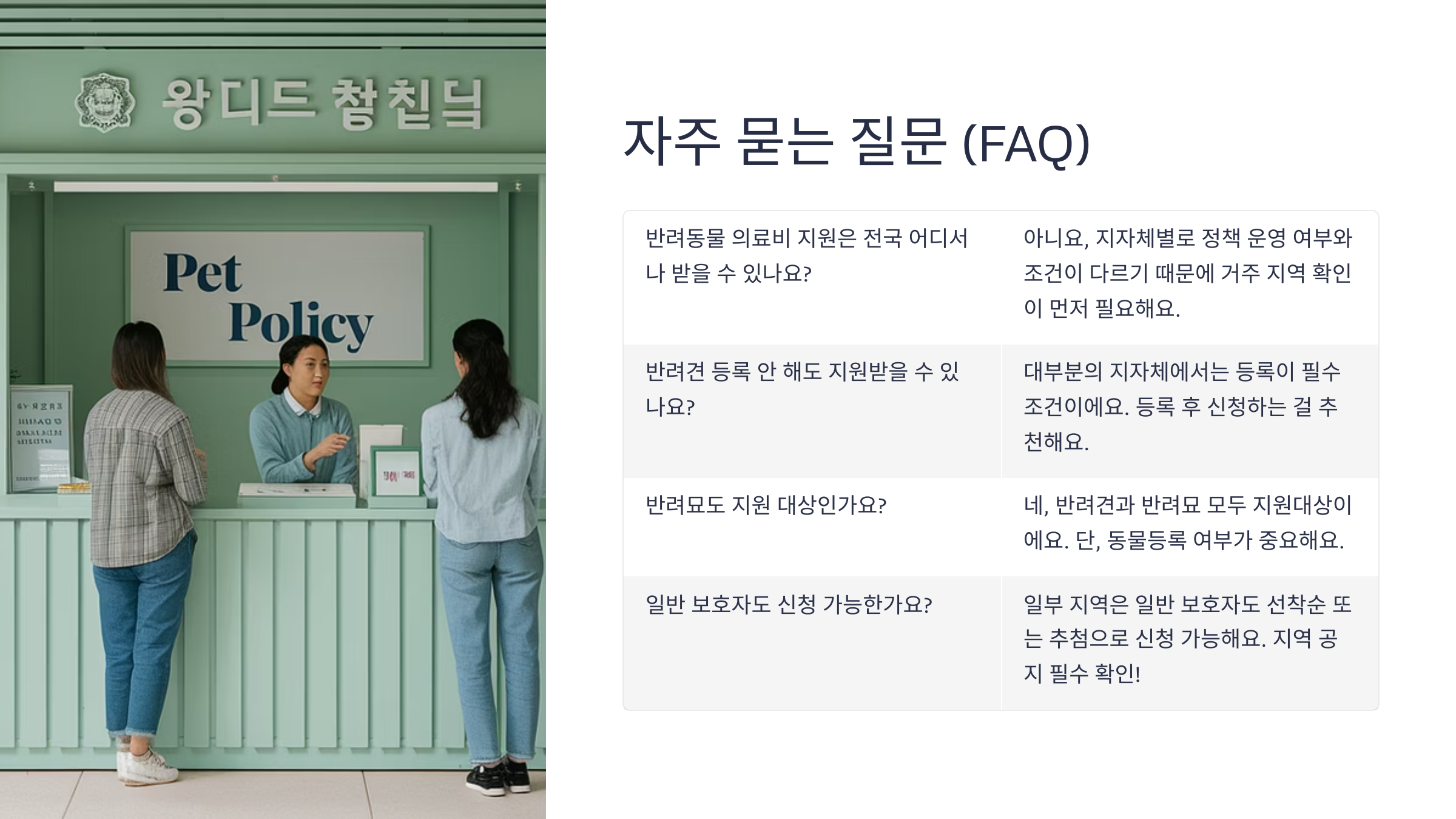 A8. 지정 동물병원이 있는 지역도 있고, 일반 병원 영수증 제출만으로 가능한 곳도 있어요. 신청 전 문의해보세요.