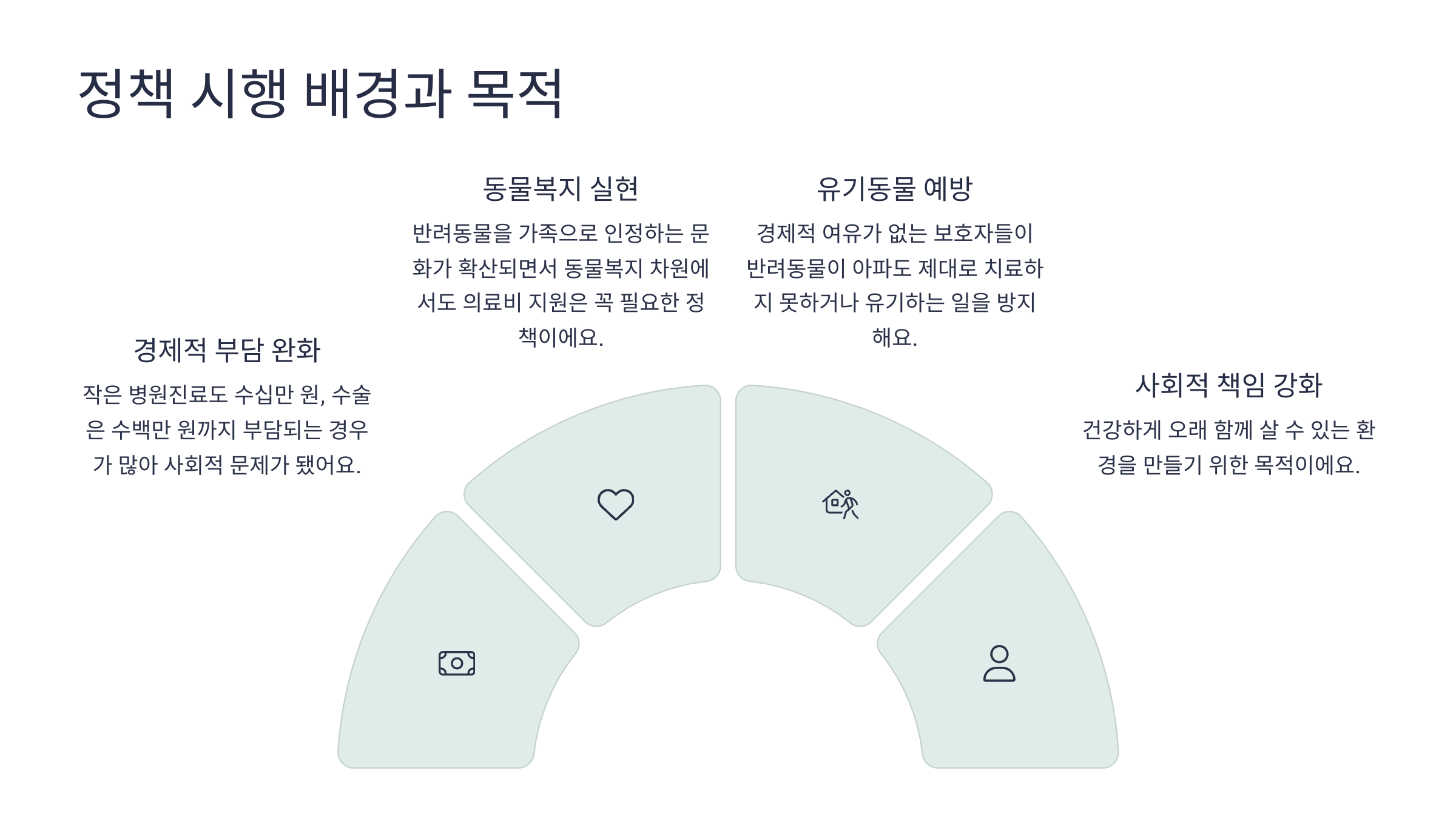 특히 경제적 여유가 없는 보호자들은 반려동물이 아파도 제대로 치료하지 못하거나 심지어 유기하는 안타까운 일이 계속 발생했어요. 이런 현실을 개선하기 위해 정부가 나선 거예요.