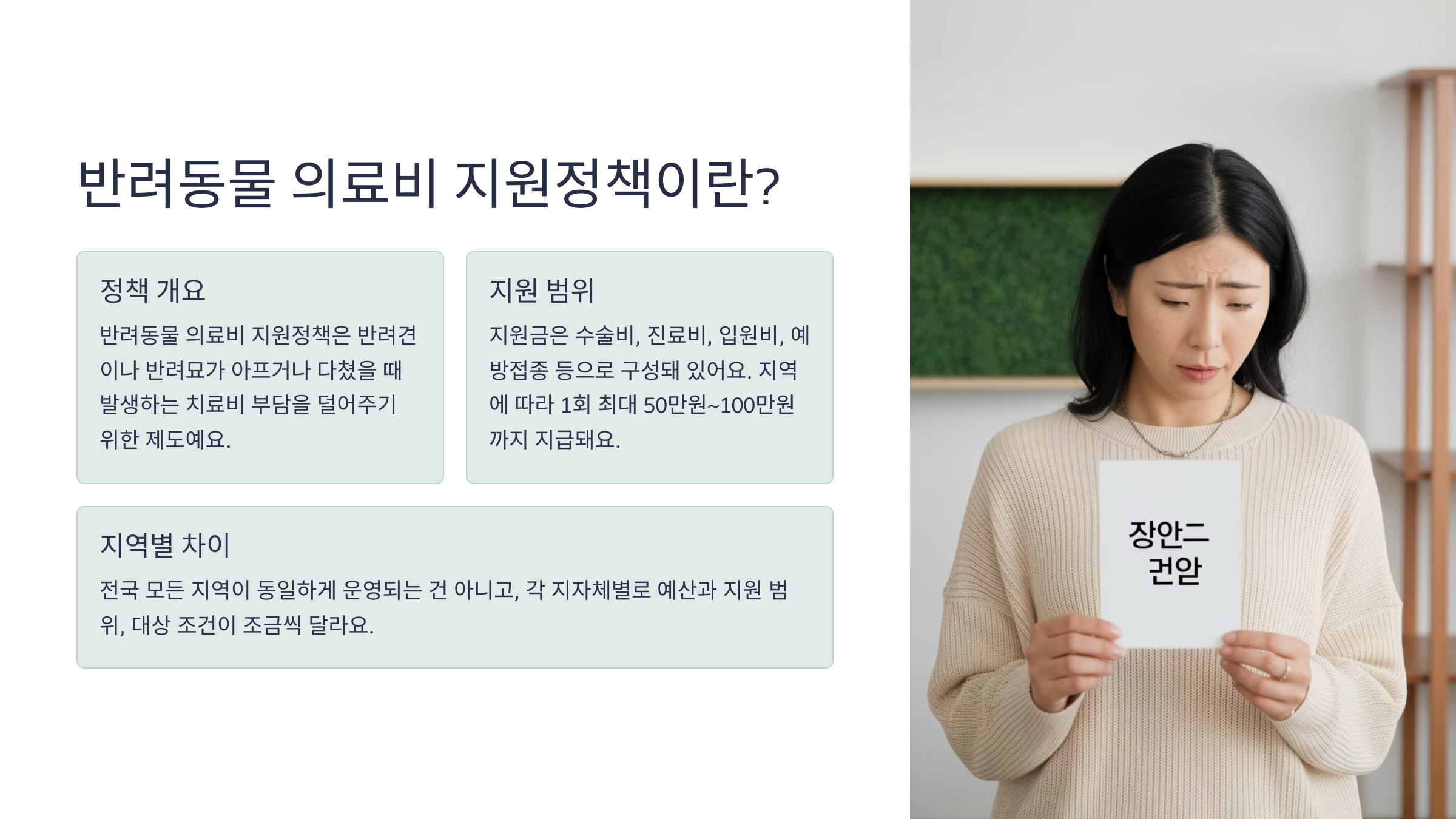 반려동물 의료비 지원정책은 반려견이나 반려묘가 아프거나 다쳤을 때 발생하는 치료비 부담을 덜어주기 위해 정부 또는 지자체에서 마련한 제도예요. 보호자가 직접 치료비 일부를 지원받을 수 있도록 설계된 거랍니다.