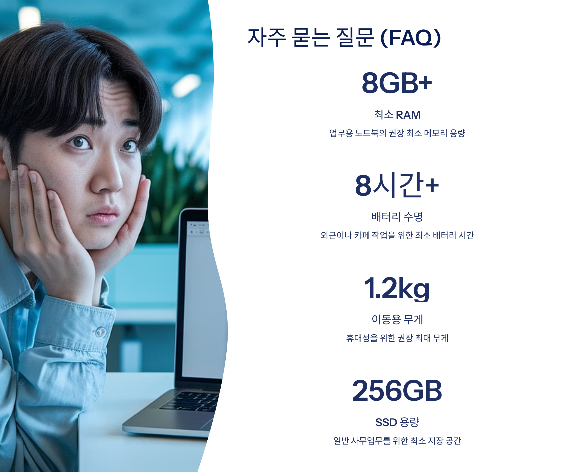 마지막으로 자주 궁금해하는 업무용 노트북 관련 FAQ 8가지를 준비했어요! 바로 아래에서 확인해볼게요 👇