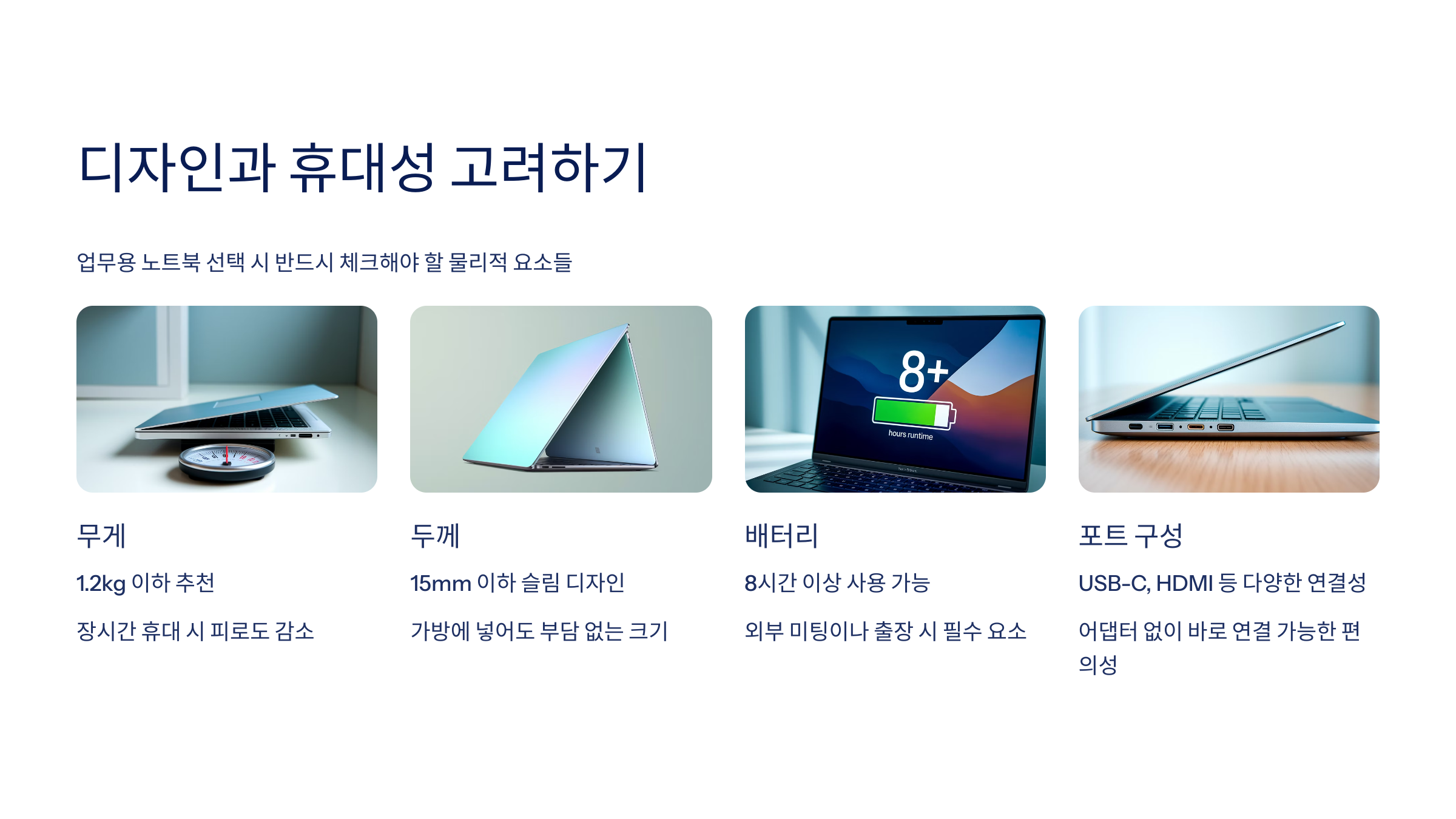 가벼운 무게, 얇은 두께, 오래가는 배터리, 키보드 배열, 포트 구성 등 실속형 디자인 요소가 바로 업무용 노트북 선택에서 중요한 기준이에요.