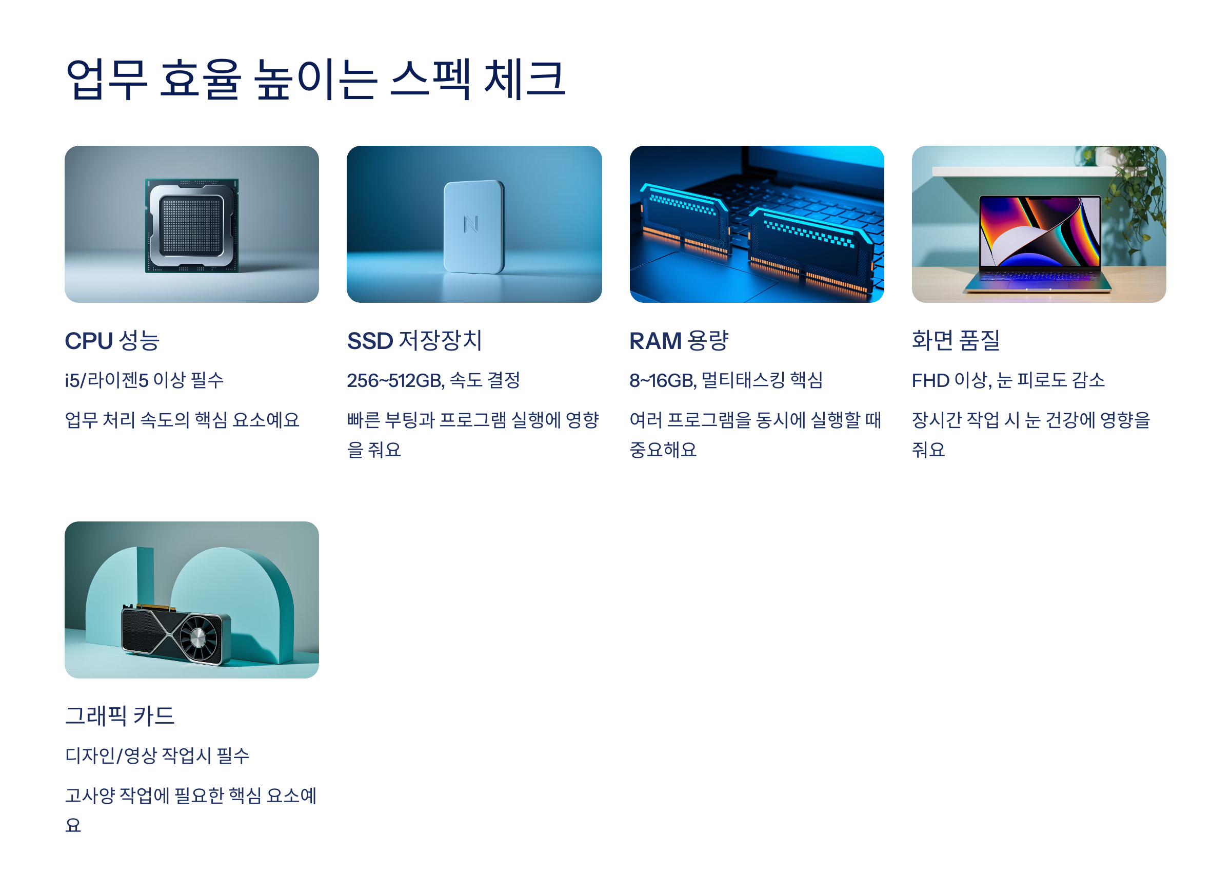 특히 CPU, RAM, SSD, 그래픽카드, 화면 등은 업무 특성에 따라 기준이 달라져요. 아래에서 각 부품별 체크 포인트를 정리해볼게요!