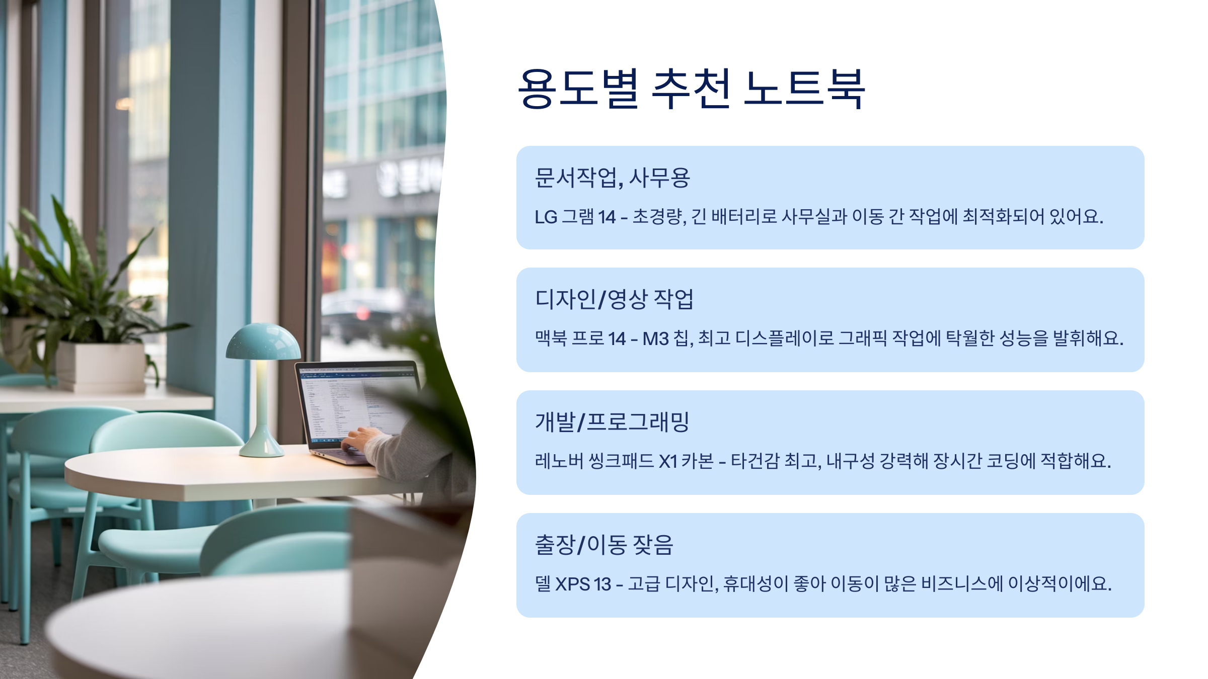 이렇게 보면 어떤 용도에 어떤 노트북이 좋은지 바로 감 잡히죠? 😎 상황별로 완전 정리해봤어요!