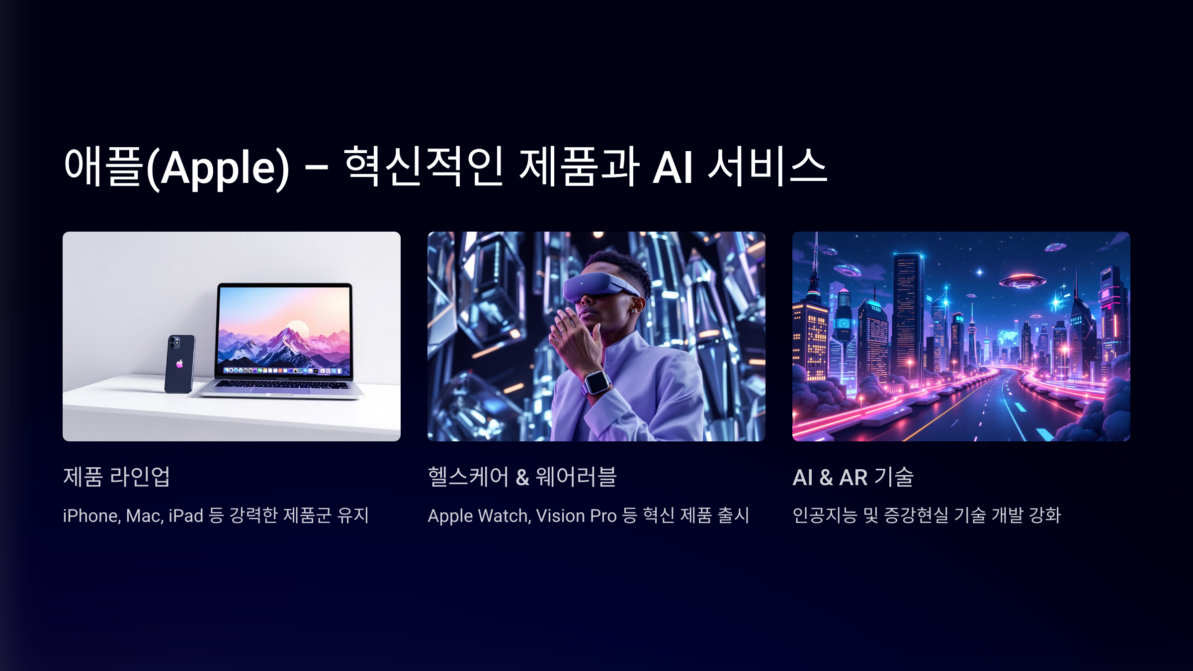 애플은 꾸준한 제품 혁신과 생태계 확장을 통해 강력한 브랜드 파워를 유지하고 있습니다. 특히 AI 및 증강현실(AR) 기반 제품을 통해 새로운 성장 동력을 확보하고 있으며, 헬스케어 및 웨어러블 기기(Apple Watch, Vision Pro)에서도 강한 성과를 보이고 있습니다.