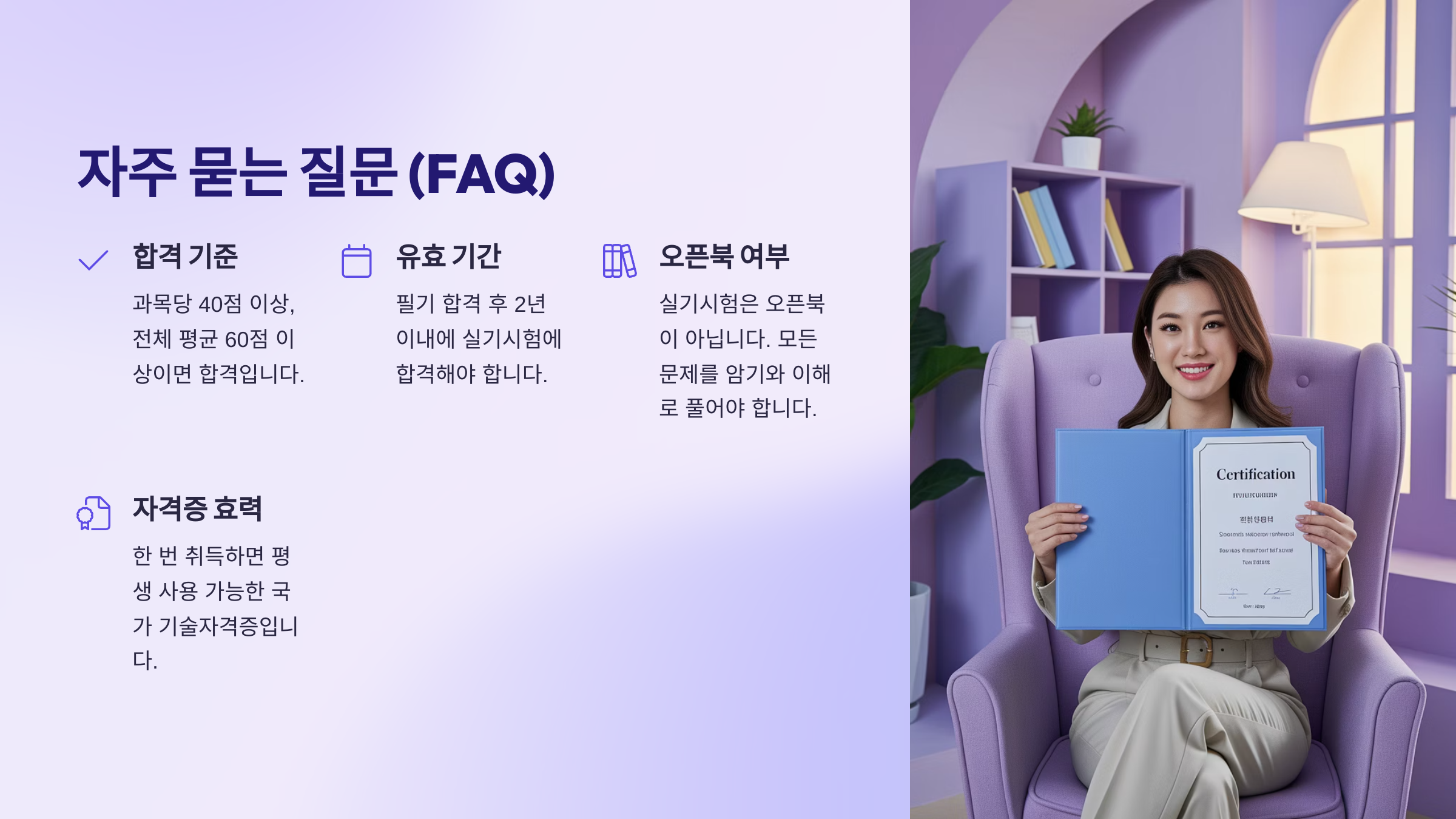 A2. 필기 합격 후 2년 이내에 실기시험에 합격해야 최종 자격증 취득이 가능해요. 기간 지나면 필기 다시 응시해야 해요.