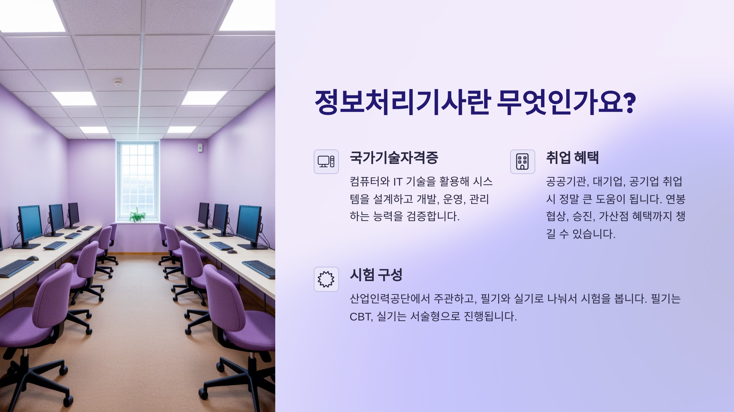 정보처리기사는 컴퓨터와 IT 기술을 활용해 시스템을 설계하고 개발, 운영, 관리하는 능력을 검증하는 국가기술자격증이에요. IT분야 대표 자격증으로 인정받고 있어서 공공기관, 대기업, 공기업 취업 시 정말 큰 도움이 된답니다.