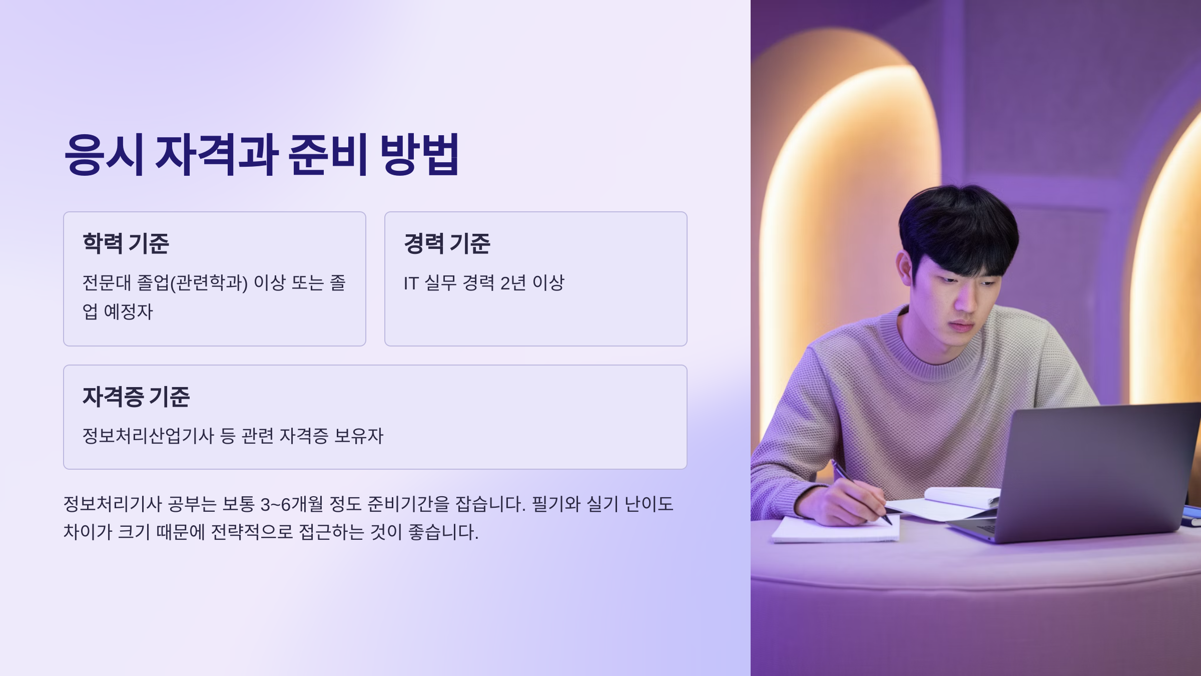 그럼 다음으로 넘어가서 정보처리기사 응시 자격과 준비 방법에 대해 자세히 알려드릴게요! 나에게 해당되는 자격조건이 있는지 꼭 확인해봐요! 😊
