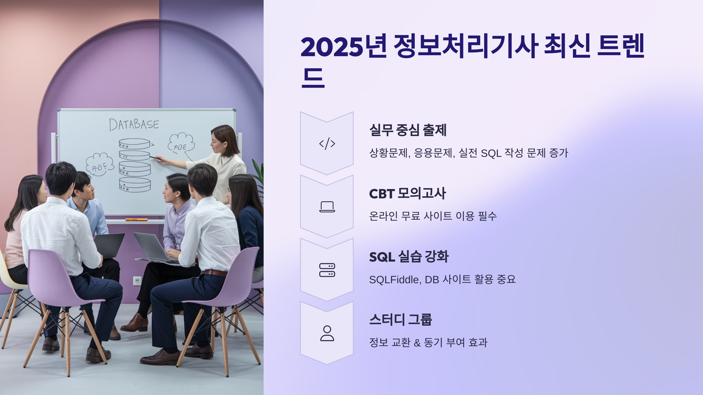 그럼 다음 섹션에서는 2025년 정보처리기사 최신 트렌드를 알려줄게요! 올해 출제경향, 실기 변화, 인기 공부법까지 총정리해볼게요! 🔥