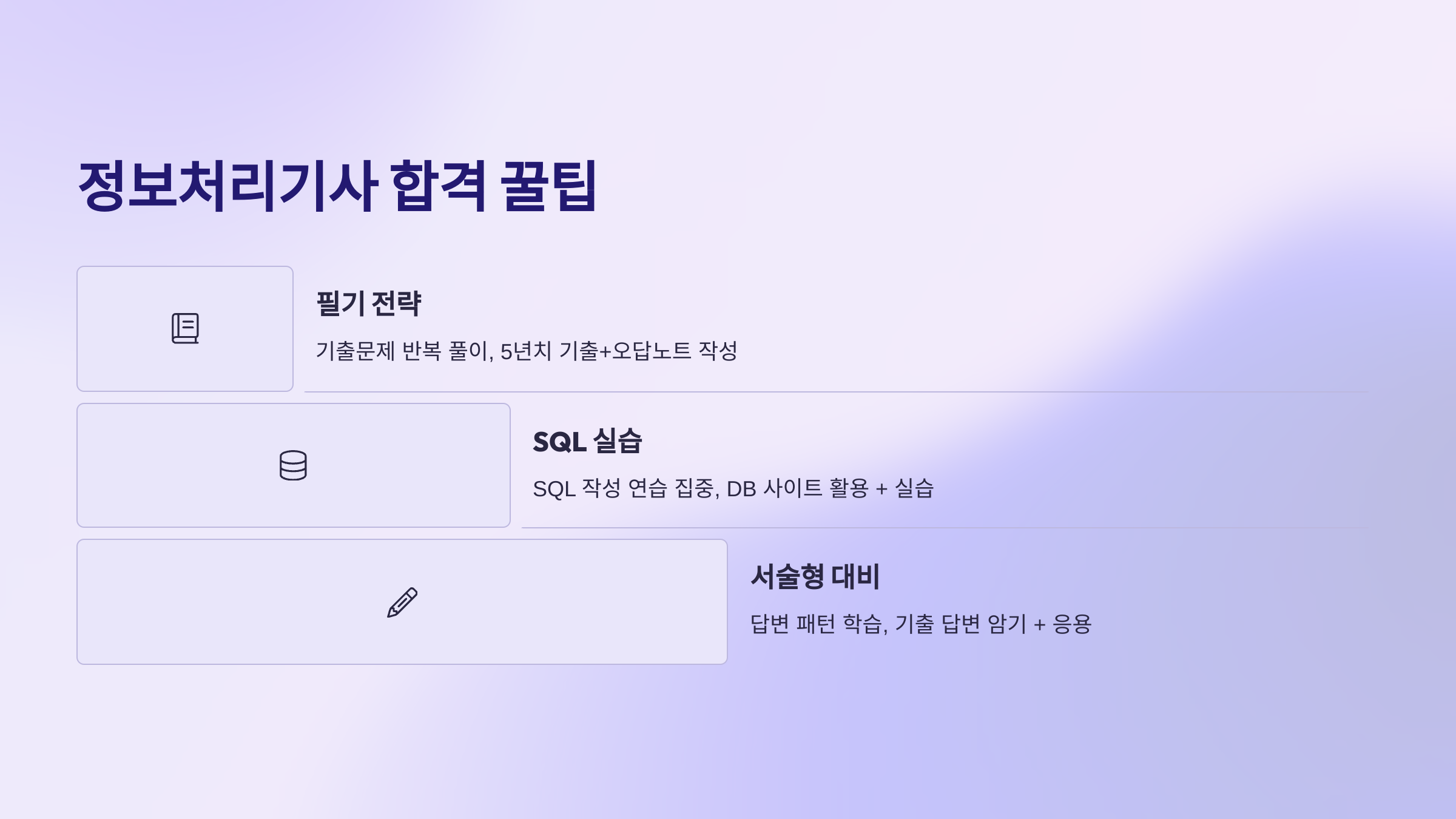 정보처리기사는 필기보다 실기가 훨씬 어렵기 때문에 실기 준비기간을 넉넉히 잡는 게 좋아요. 필기 공부는 반복 암기가 답! 실기는 서술형 답변 패턴 익히기 + SQL 코딩 연습이 핵심이에요.