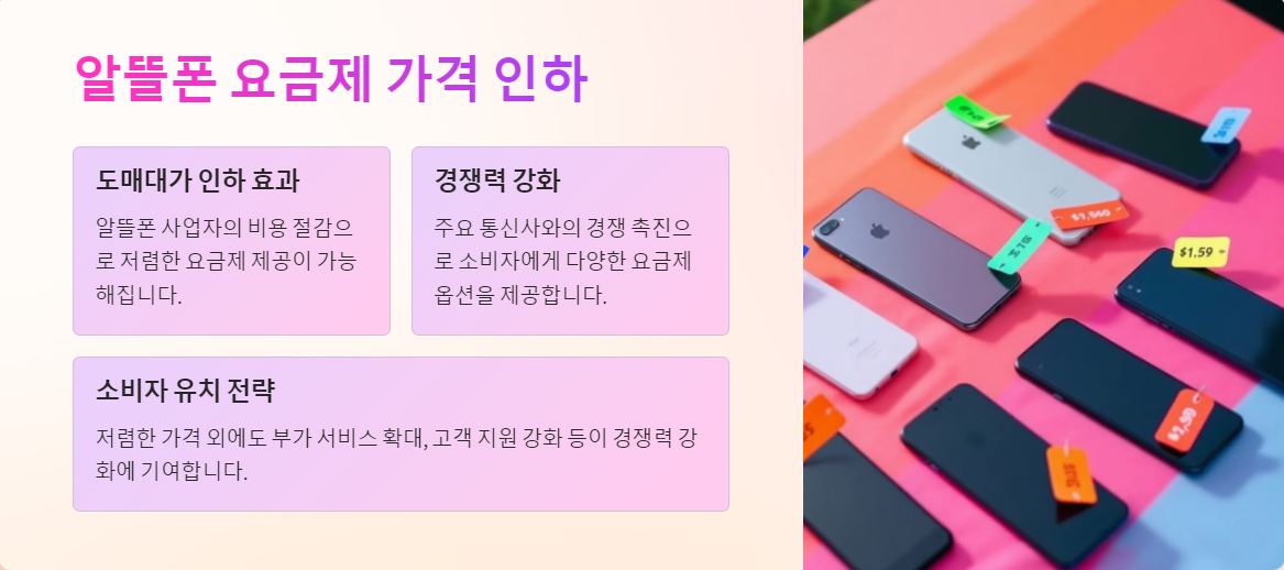 알뜰폰 사업자는 주요 통신사로부터 네트워크를 임대해 사용하는 구조입니다. 도매대가 인하는 알뜰폰 사업자의 비용 절감을 가능하게 하고, 이를 소비자에게 반영함으로써 저렴한 요금제를 제공할 수 있습니다.