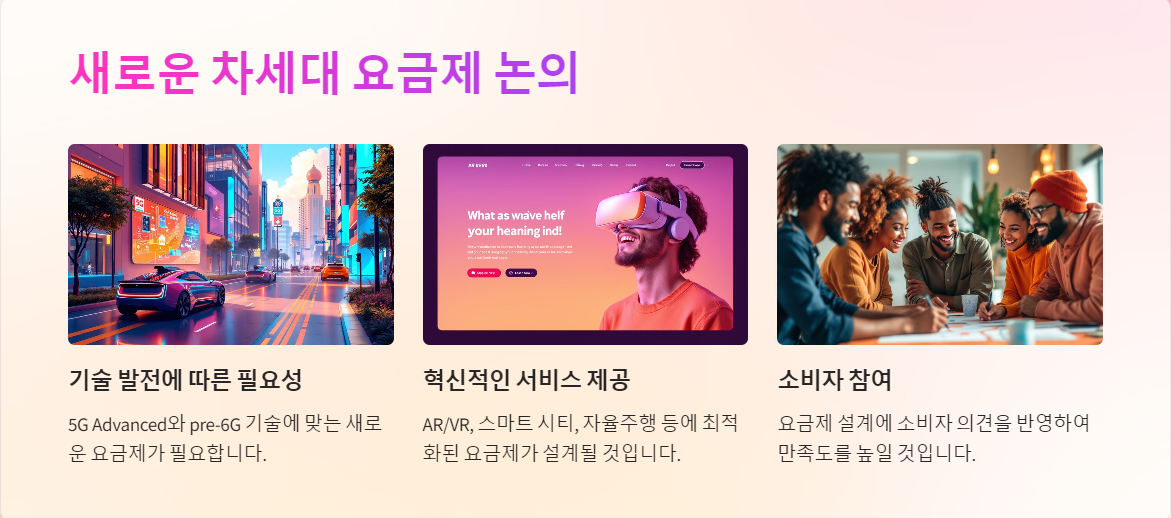차세대 요금제는 AR/VR, 스마트 시티, 자율주행 등 혁신적인 서비스에 최적화된 형태로 설계될 가능성이 높습니다.