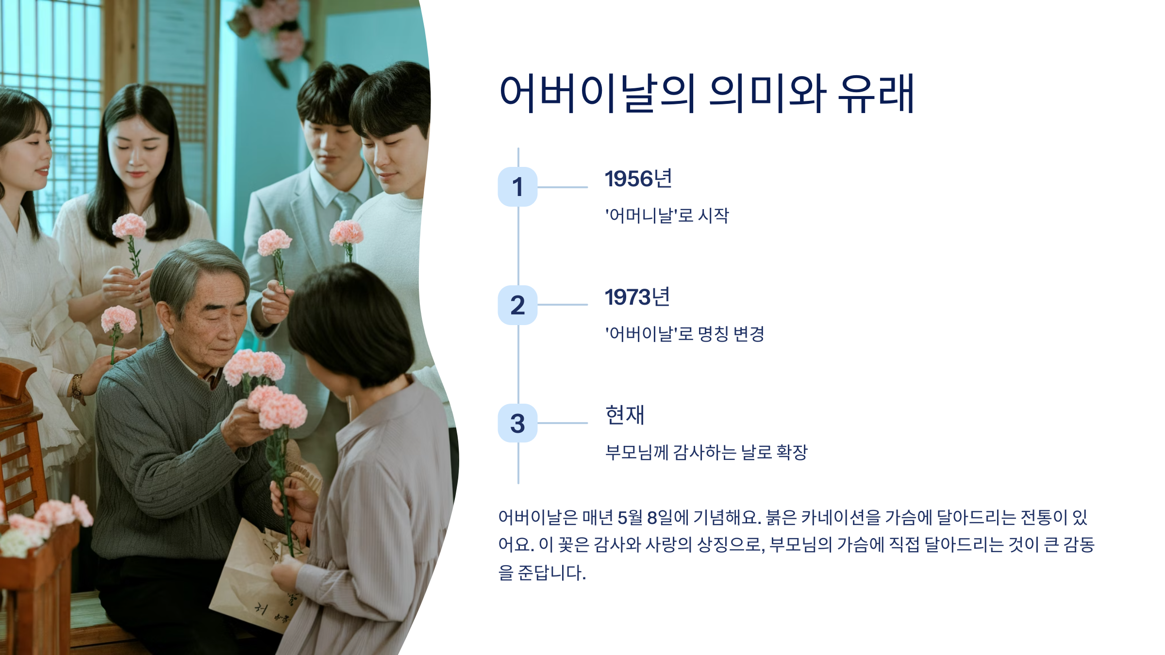 어버이날은 부모님께 감사한 마음을 표현하는 날로, 한국에서는 매년 5월 8일에 기념해요. 이 날은 단순한 기념일을 넘어, 가족의 소중함을 되새기고 사랑을 전하는 특별한 시간이죠. 1956년부터 '어머니날'로 시작되었지만, 1973년부터 '어버이날'로 명칭이 바뀌어 아버지와 어머니 모두에게 감사하는 날로 확장되었답니다.