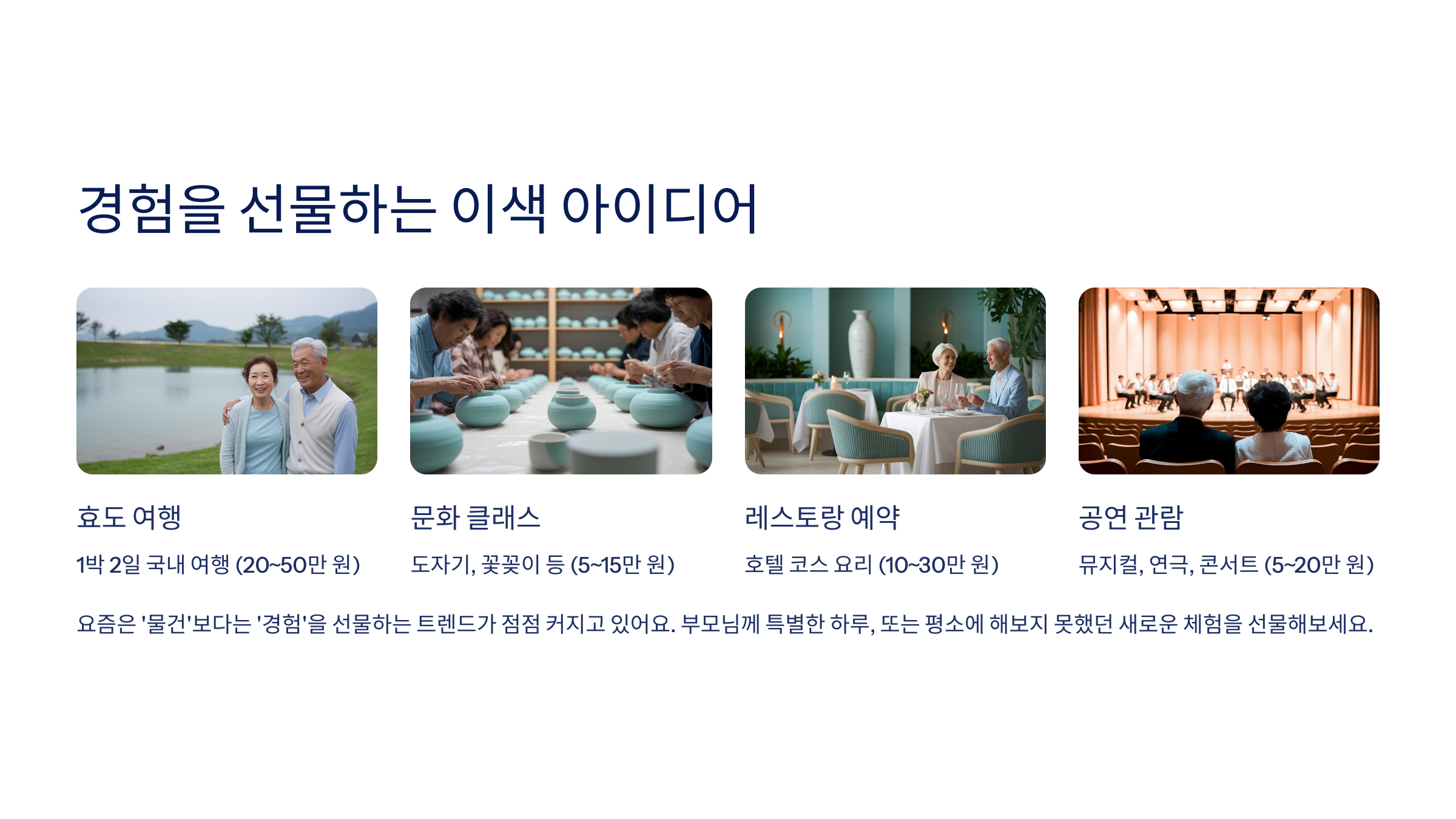 요즘은 ‘물건’보다는 ‘경험’을 선물하는 트렌드가 점점 커지고 있어요. 부모님께 특별한 하루, 또는 평소에 해보지 못했던 새로운 체험을 선물해보는 건 어떨까요? 이런 선물은 선물 그 자체보다도 ‘기억’으로 오래 남는다는 점에서 특별함이 배가돼요.