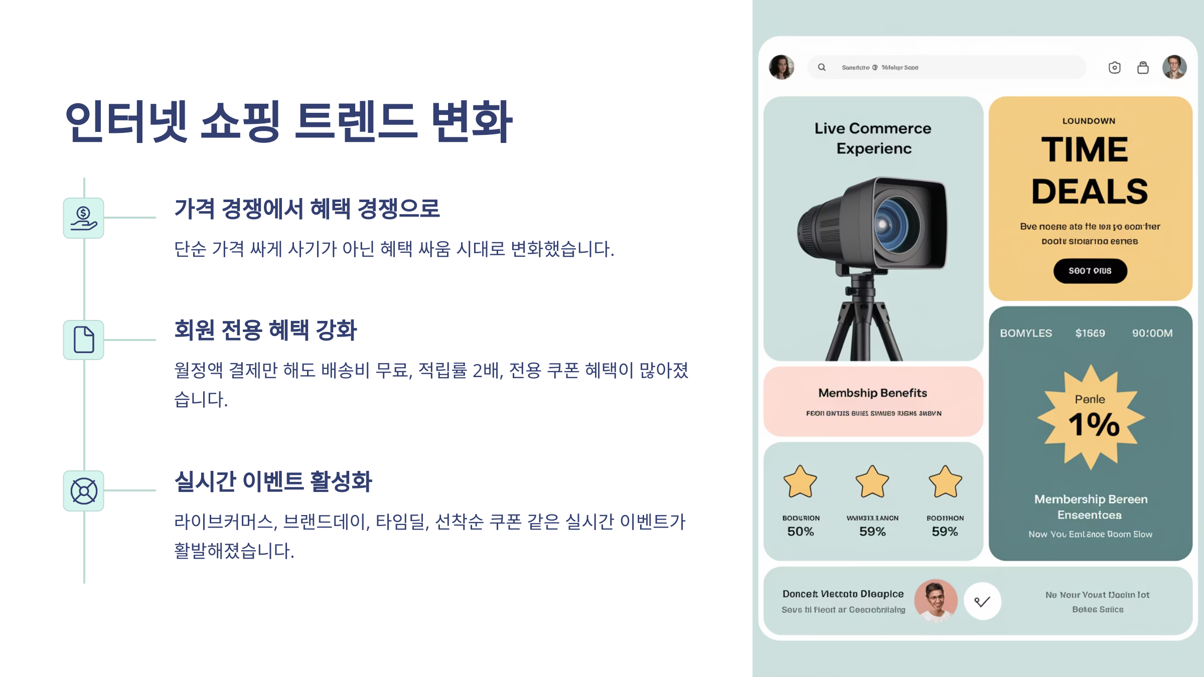또한 라이브커머스, 브랜드데이, 타임딜, 선착순 쿠폰 같은 실시간 이벤트도 활발해지면서 소비자들은 하루에도 몇 번씩 쇼핑 기회를 얻을 수 있게 되었어요.