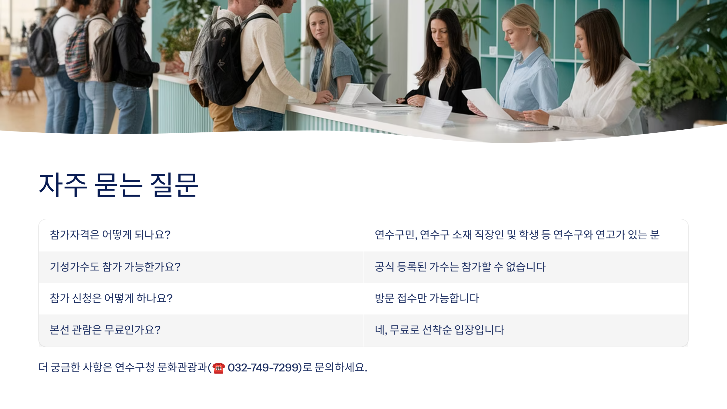 궁금한 점이 있다면 언제든지 연수구청 문화관광과 (☎ 032-749-7299)로 문의하세요. 친절하게 안내해주실 거예요! 😊