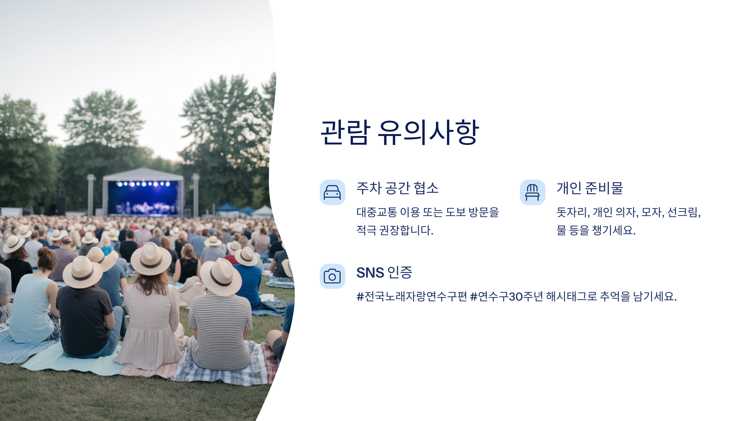 무대 관람 후 인증샷이나 SNS 공유는 필수! #전국노래자랑연수구편 #연수구30주년 이런 해시태그로 추억을 남겨보세요. 📸