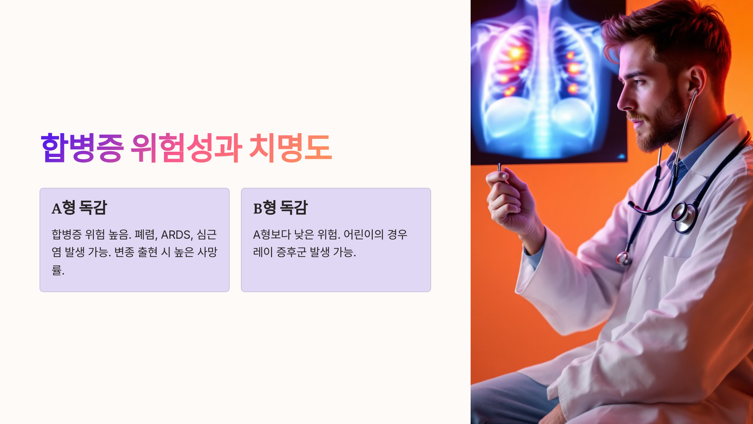 이처럼 A형 독감이 더 강한 전파력을 가지고 있어요. 하지만 B형 독감도 방심하면 안 돼요! 다음으로 합병증 위험과 치명도를 비교해볼게요. 🏥