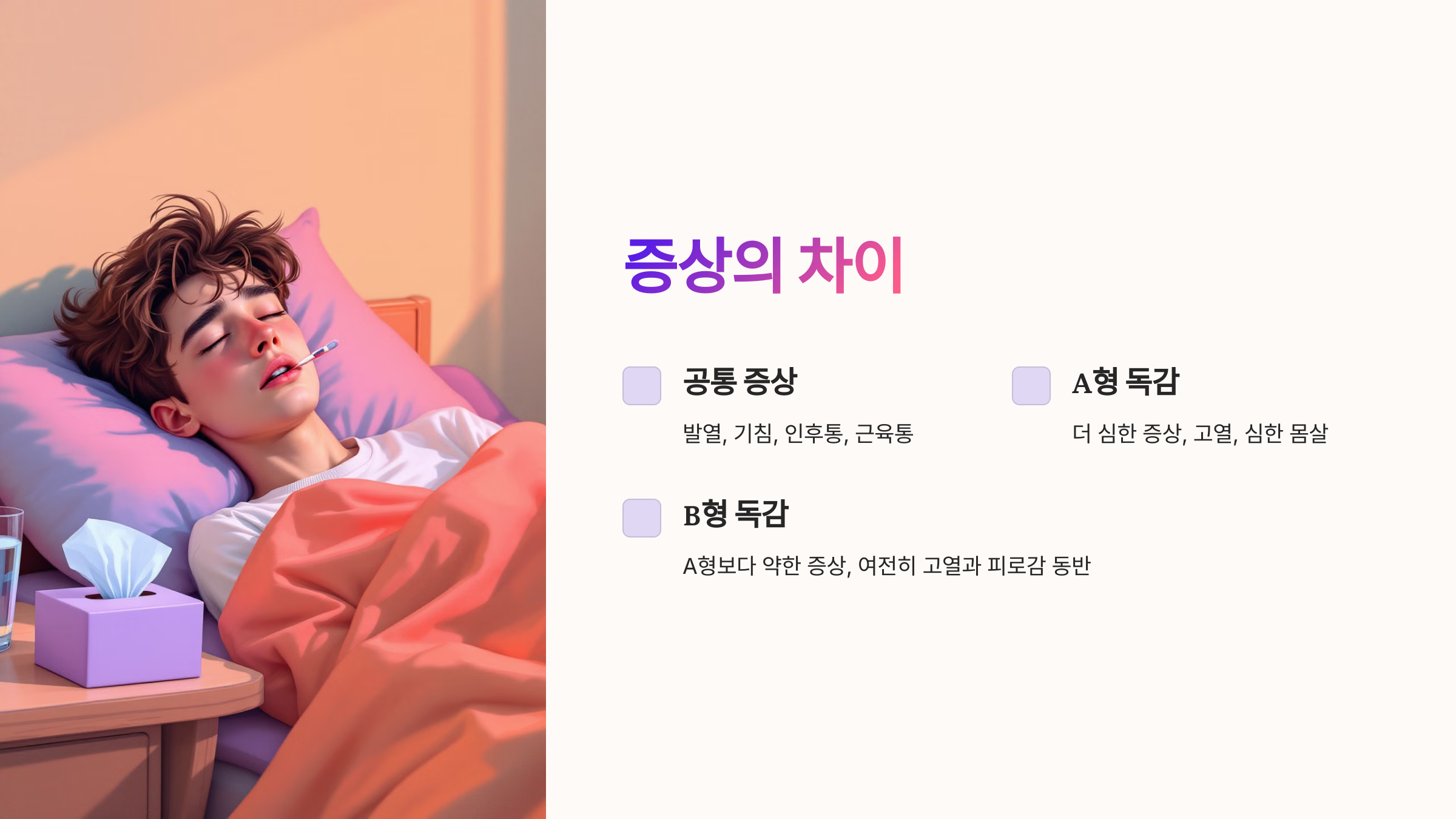 이제 A형과 B형 독감의 차이를 기본적으로 이해했어요! 다음으로는 증상의 차이점을 자세히 살펴볼게요. 🏥