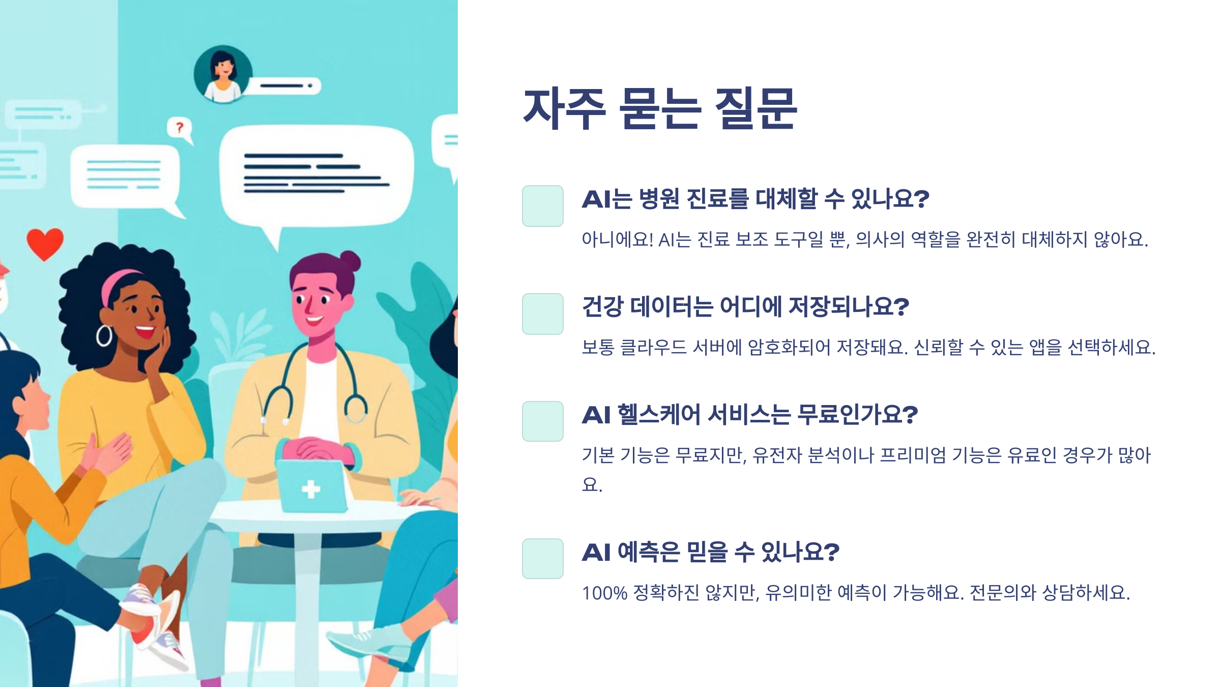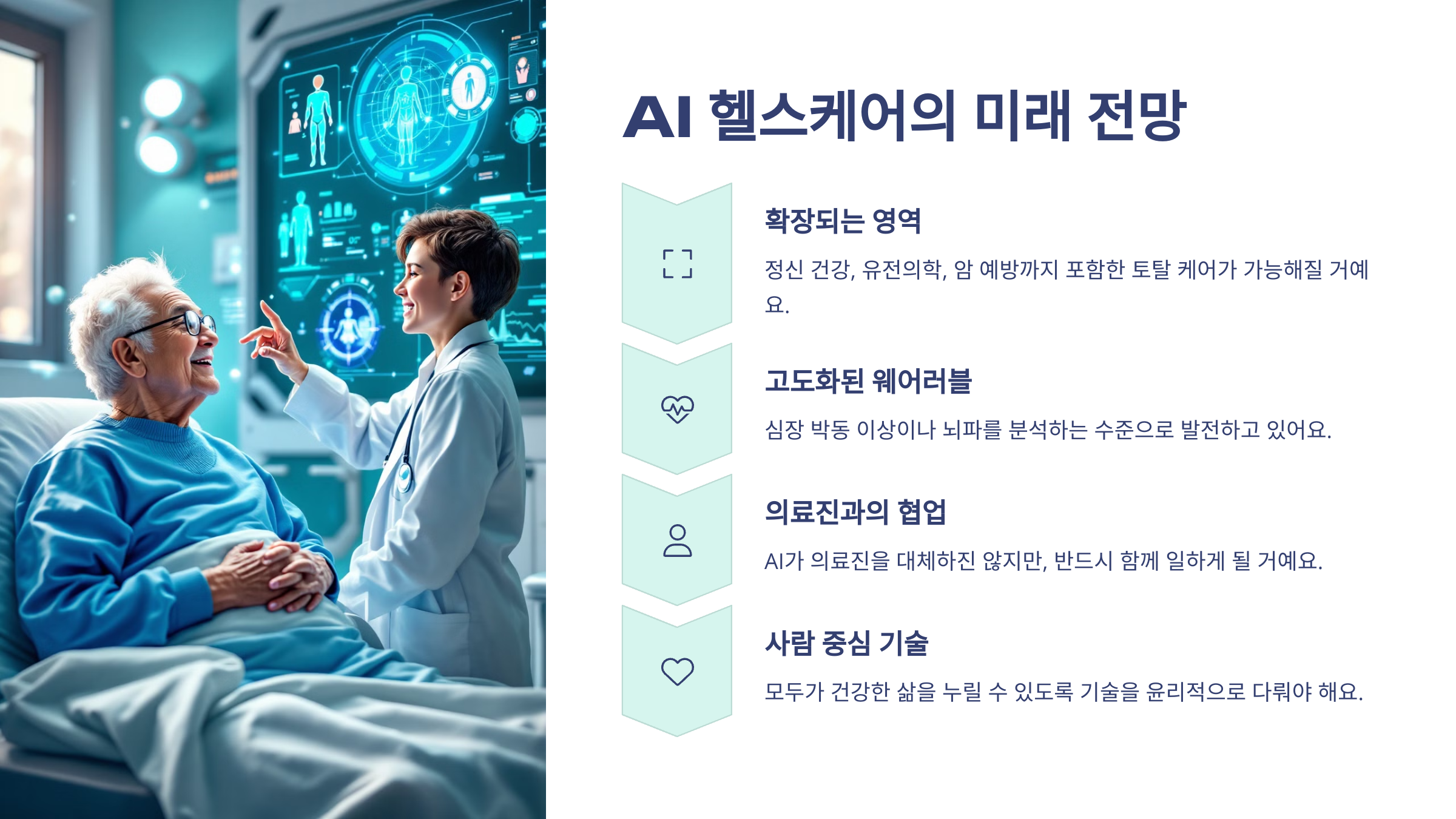 AI 헬스케어의 미래는 ‘기술’이 아니라 ‘사람’에 중심을 둘 때 더 빛날 거예요. 모두가 건강한 삶을 누릴 수 있도록 기술을 윤리적으로 잘 다루는 게 핵심이랍니다.