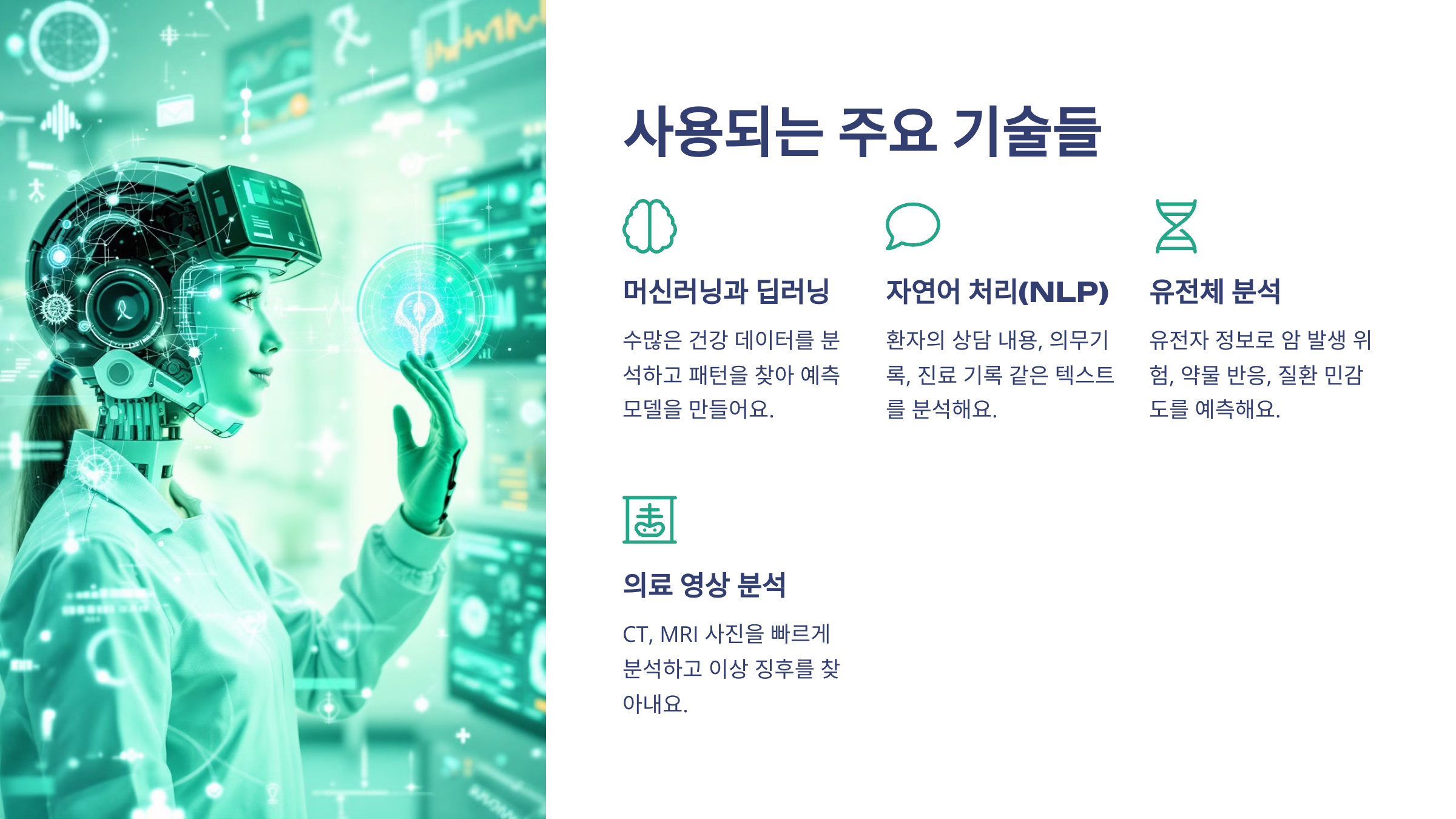 또한, 자연어 처리(NLP) 기술은 환자의 상담 내용, 의무기록, 의사의 진료 기록 같은 텍스트 기반 데이터를 분석하는 데에 사용돼요. 덕분에 AI는 말로 하는 증상 설명도 이해할 수 있게 되었답니다.