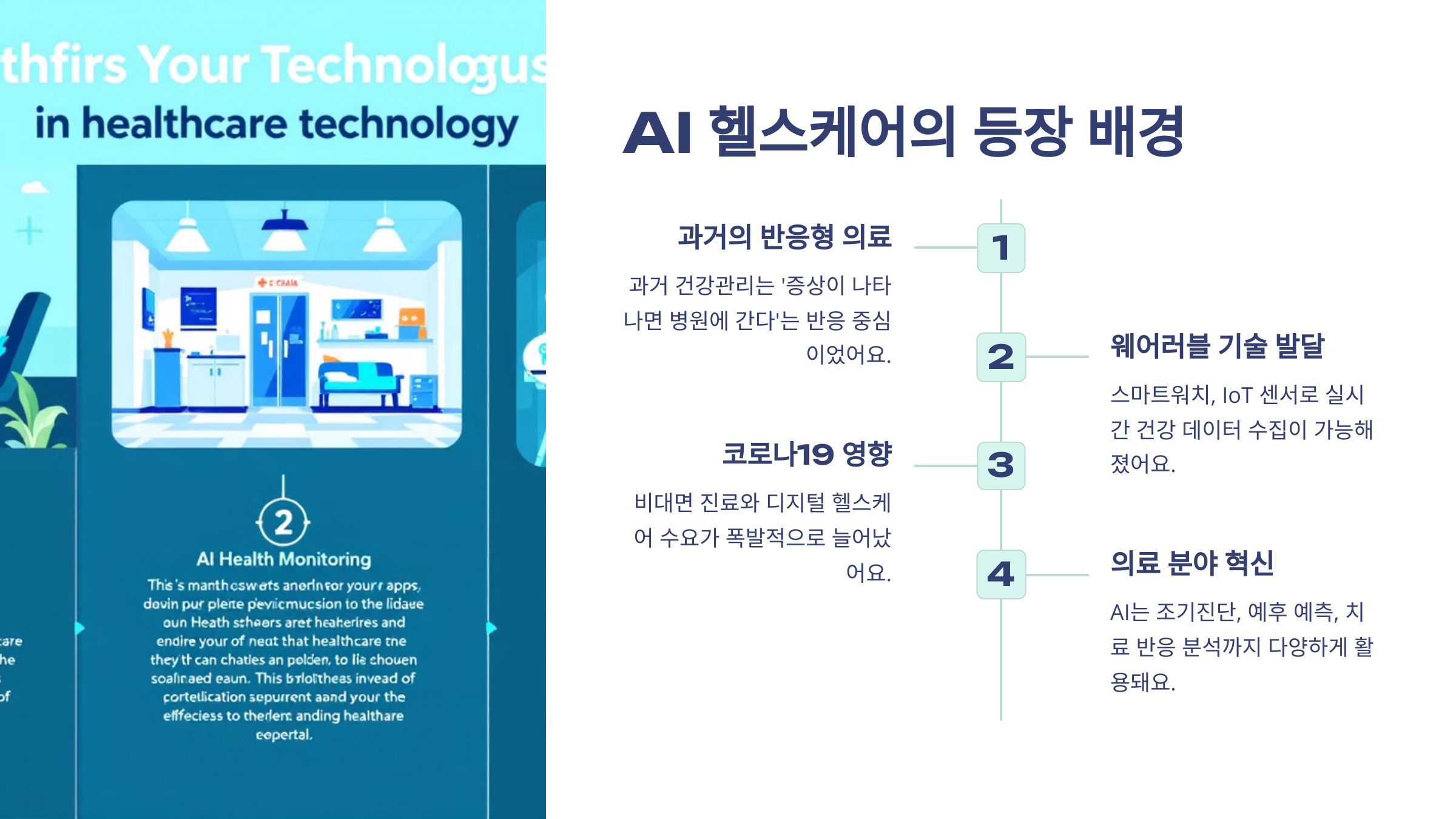 과거의 건강관리는 대체로 '증상이 나타나면 병원에 간다'는 반응 중심이었어요. 하지만 요즘은 병이 생기기 전에 예방하고, 내 몸의 데이터를 기반으로 한 개인화된 케어가 중요한 시대예요. 여기서 AI 기술이 활약하게 된 거죠!