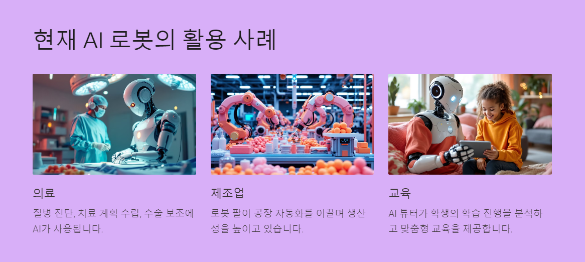 현재 AI 로봇은 다양한 분야에서 활발히 활용되고 있습니다.